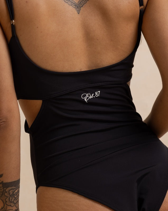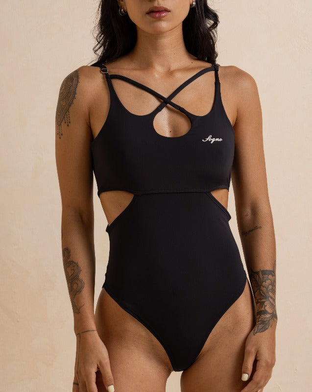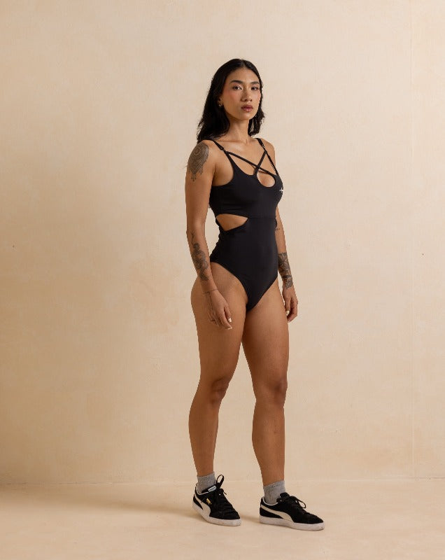Body en tela licra negra con broche en la parte baja, cargaderas ajustables, logotipo en alta densidad, escote en frente y espalda, con una silueta ajustada y combina muy bien con looks fiesteros, deportivos o de calle.