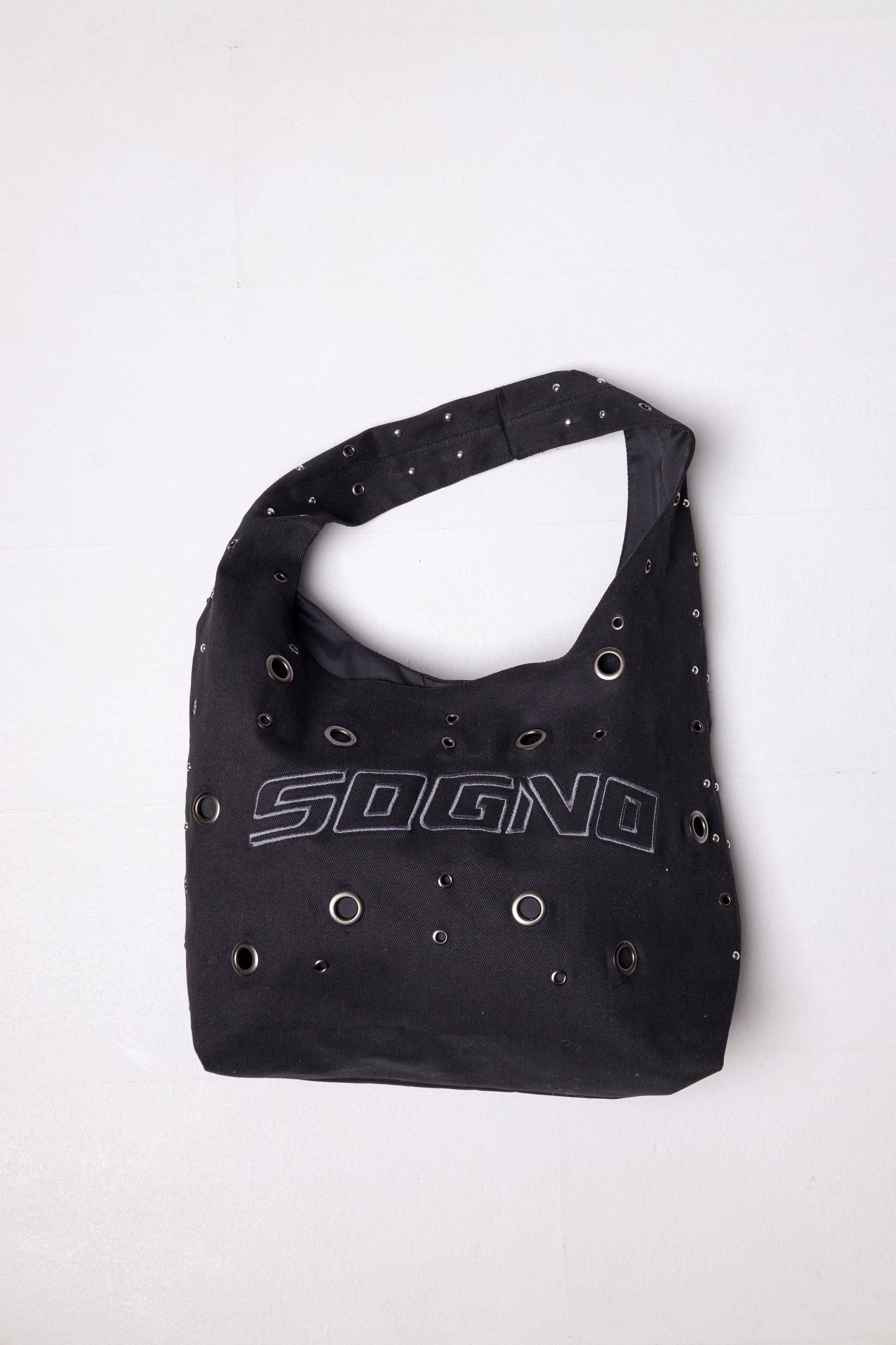 Hobo bag en tela drill con detalles en taches y bordado.