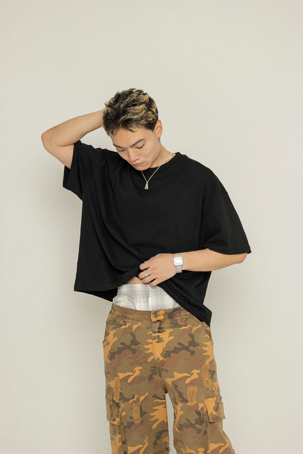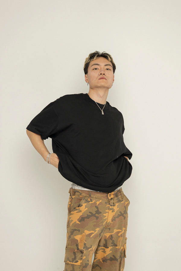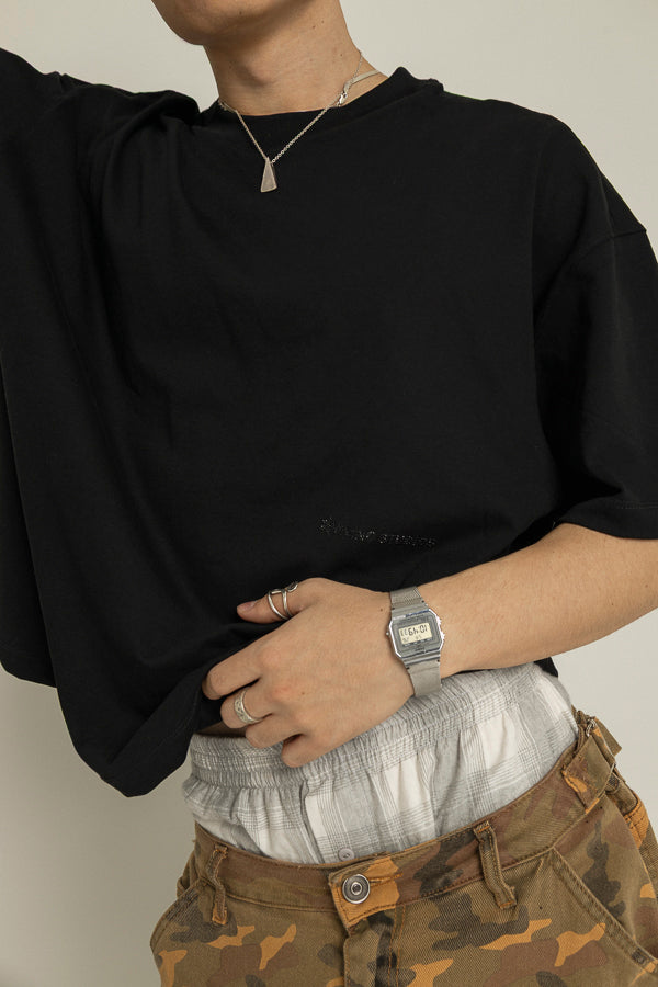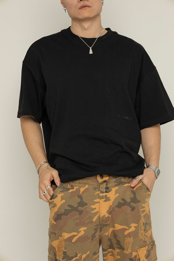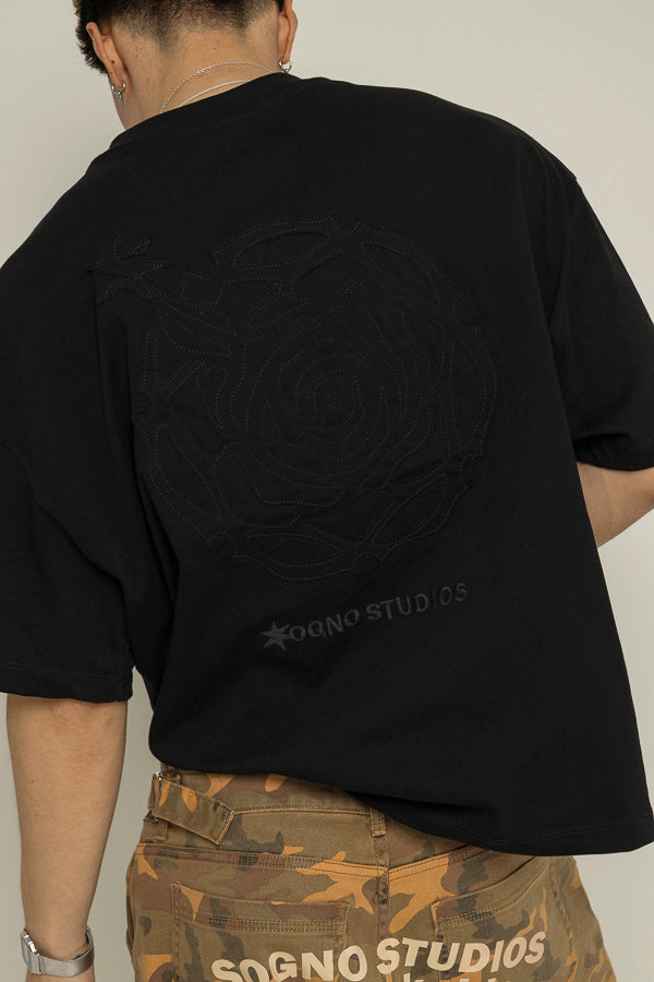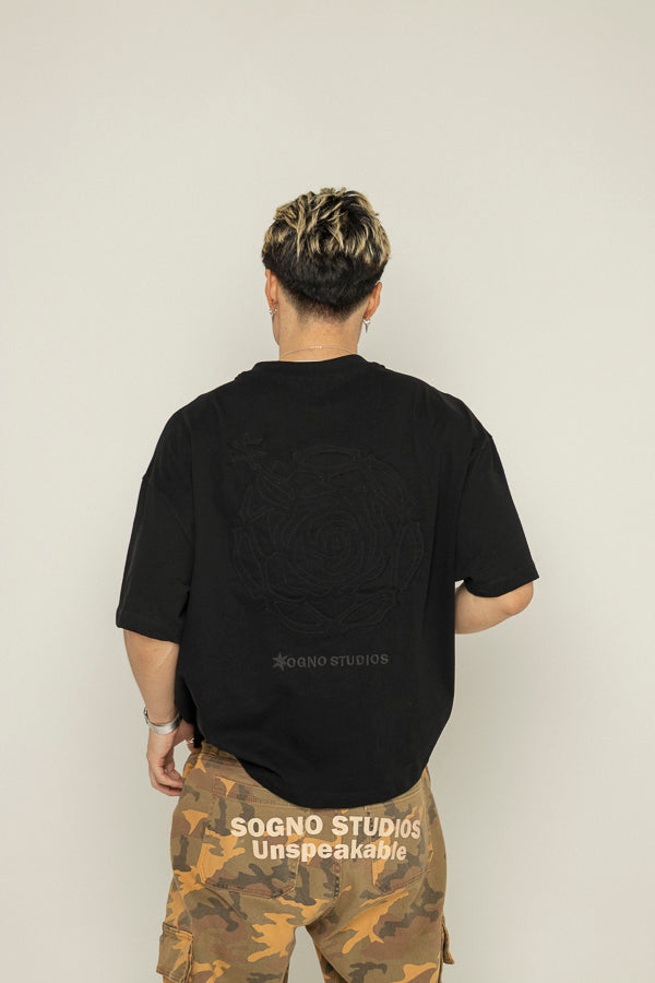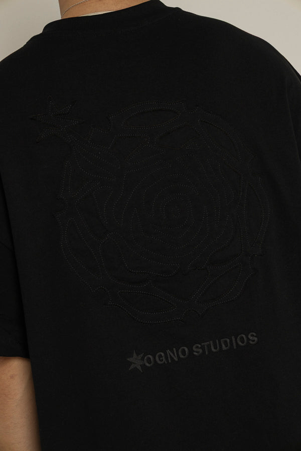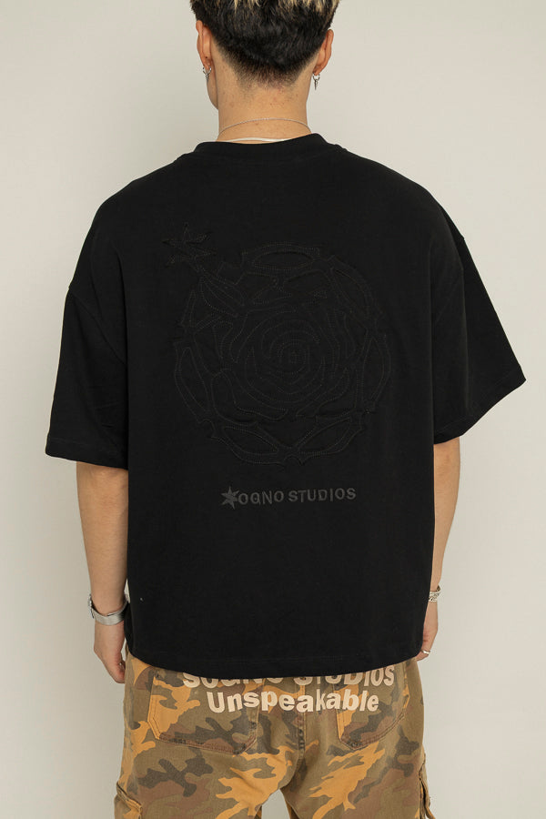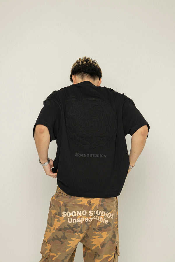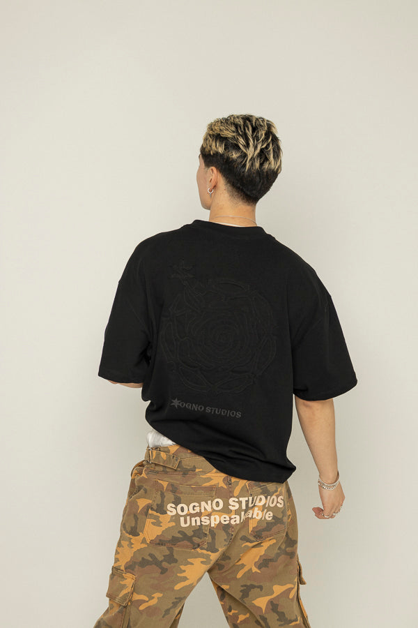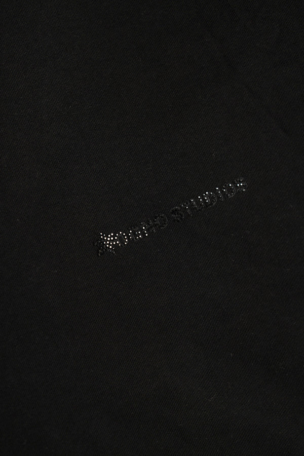 Hecha en 100% algodón alto gramaje y con fit boxy, esta camiseta trae estampado en frente con piedras negras y aplique bordado en espalda. Combina muy bien con nuestros jeans y pantalones.