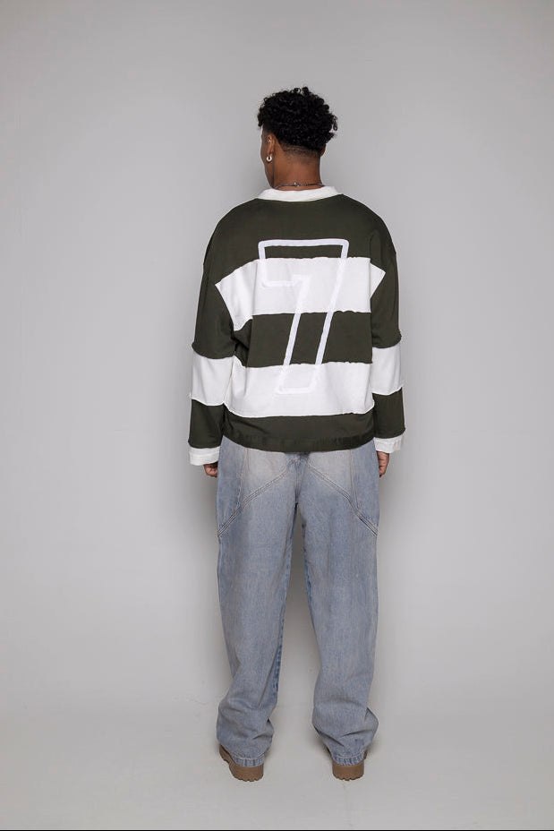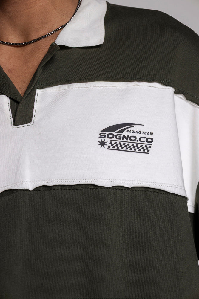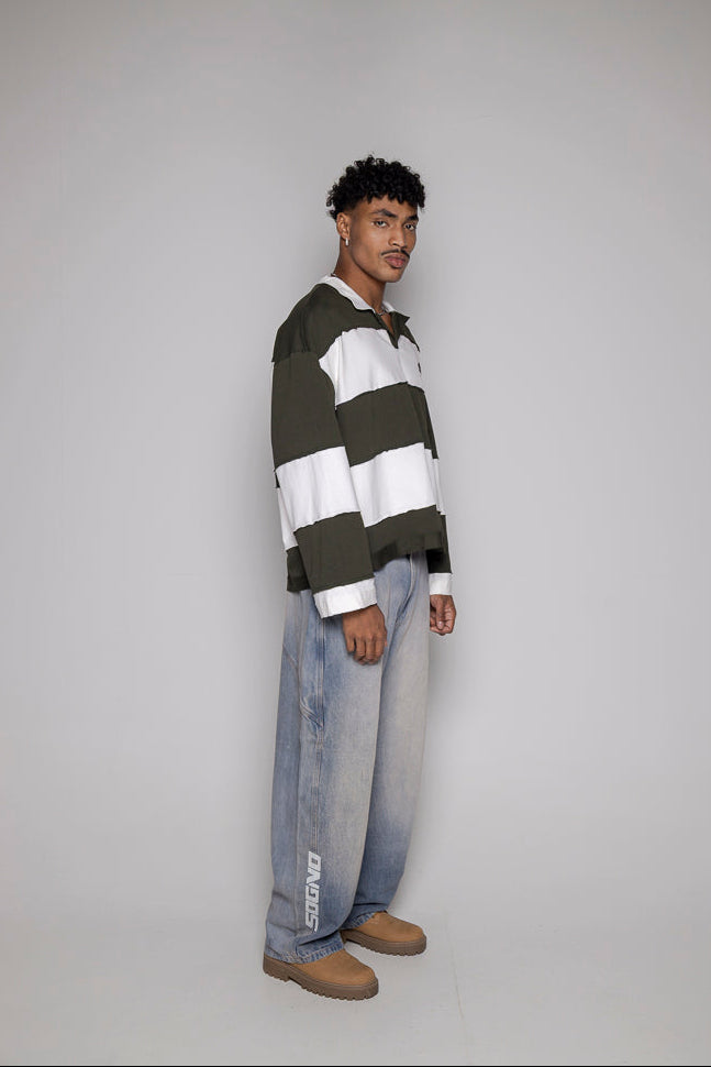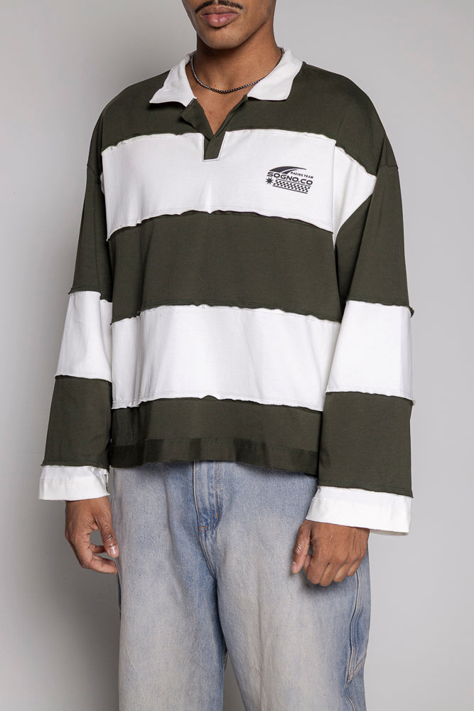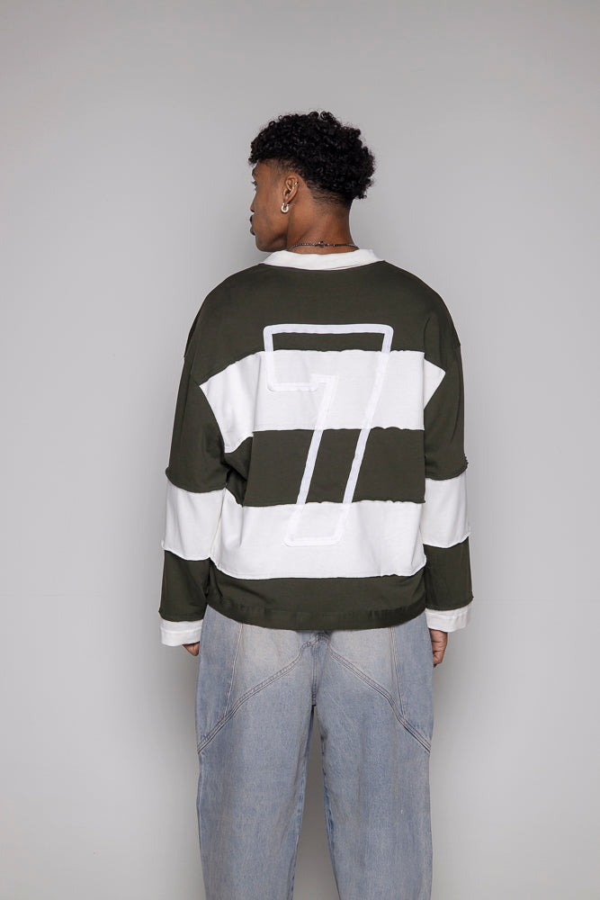 Buzo unisex tipo polo, lleva estampado en frente y bordado en espalda con cortes tipo rallas.