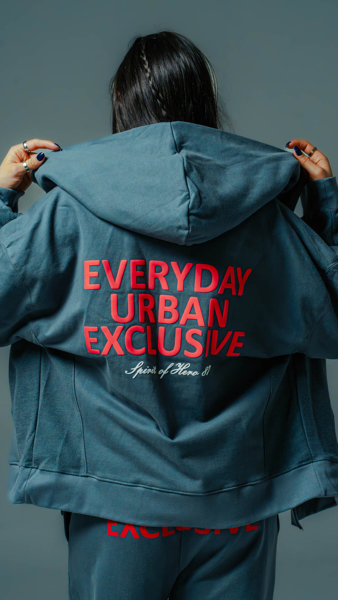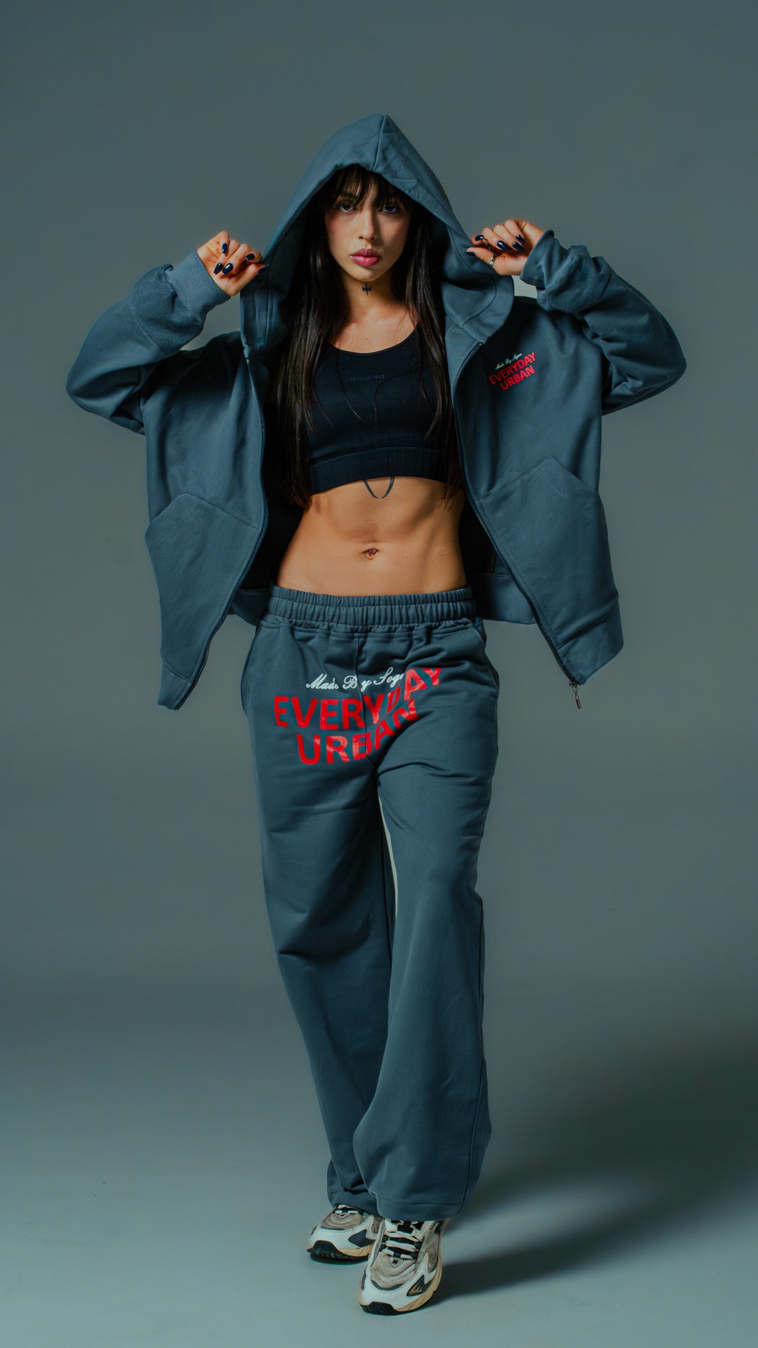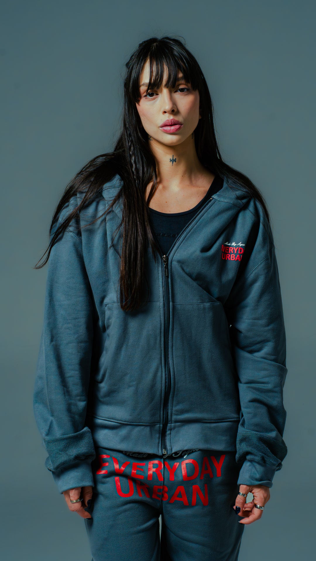 Buzo en burda unisex con cierre y chompa, lleva estampado en frente y espalda, lleva puños y fajones en rib.