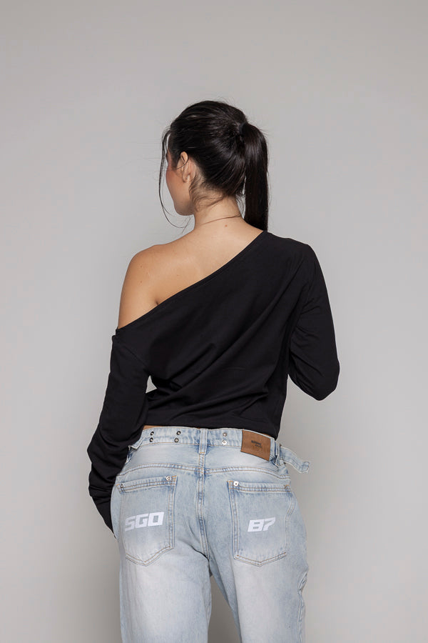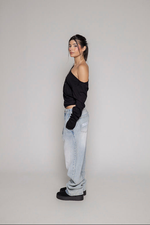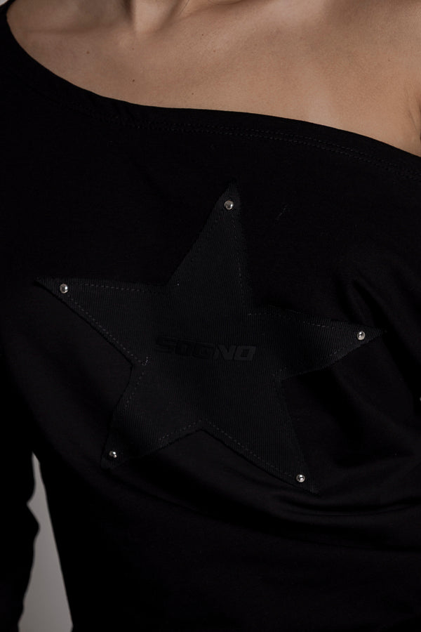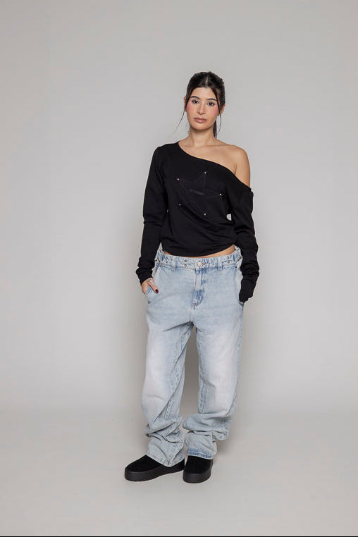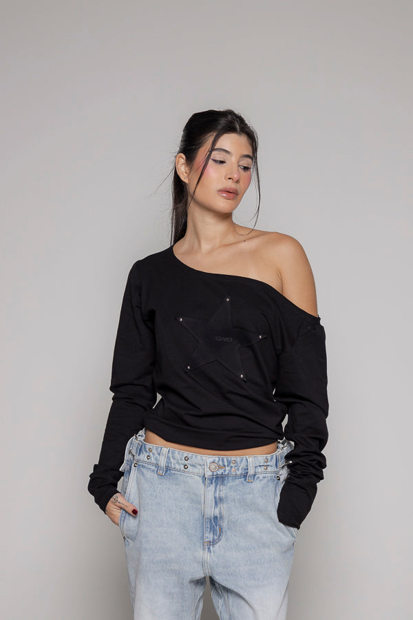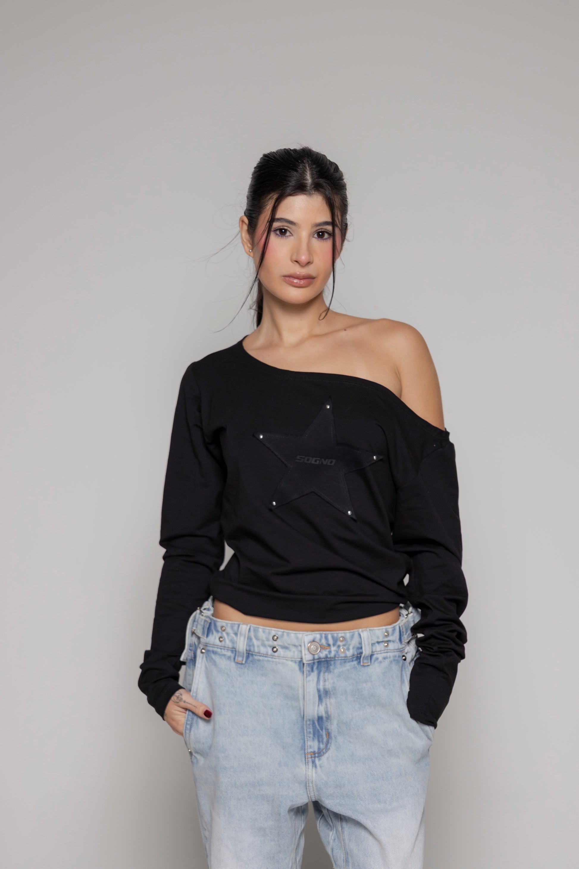 Disfruta de un look moderno y elegante con nuestro buzo drapeado colección Remainder . Con su color negro y estampado en frente y aplique con taches, este buzo es perfecto para combinar con cargos, parachutes, jeans y pantalones.
