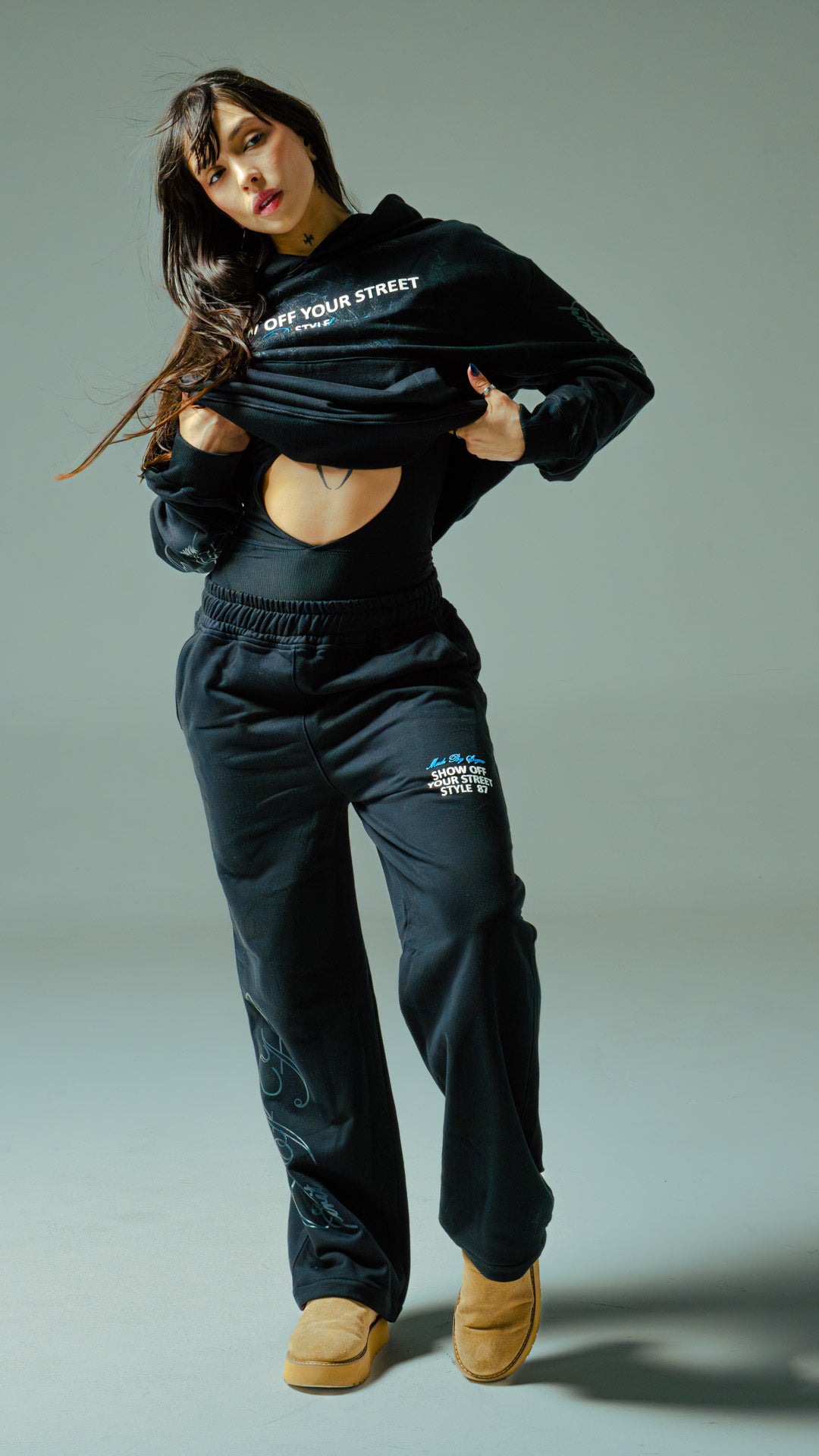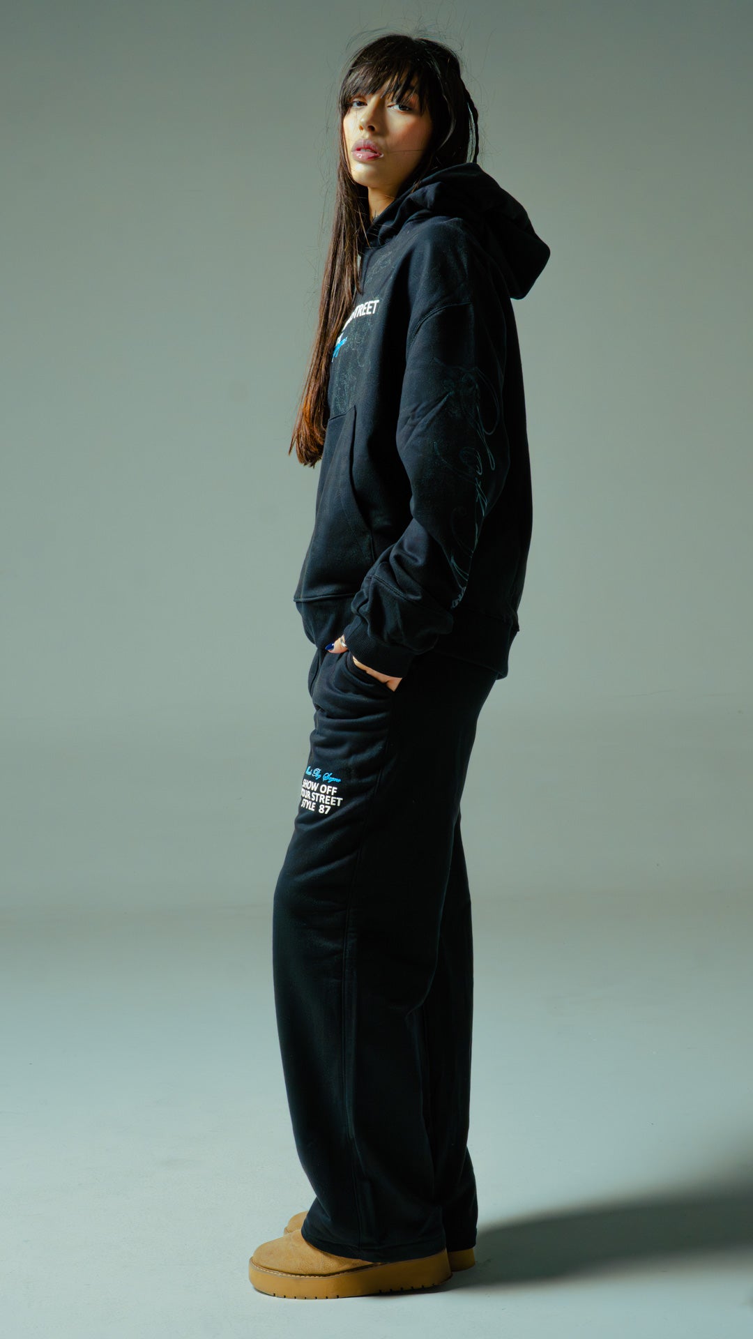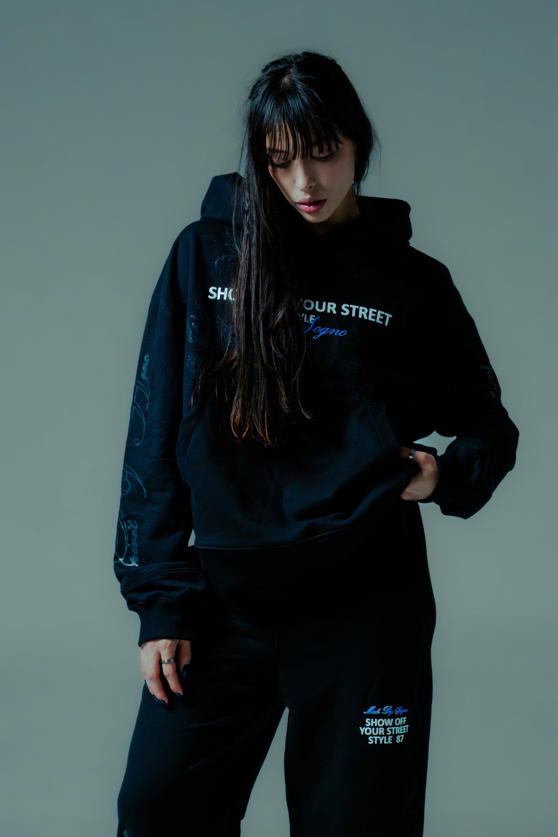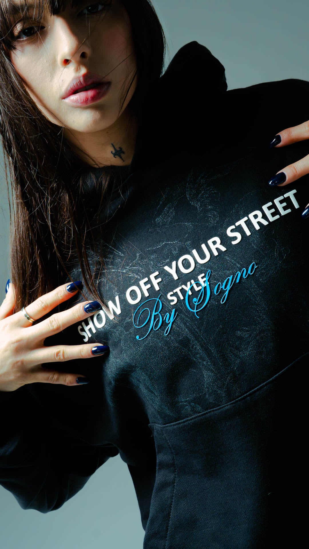 Buzo en burda unisex con chompa, lleva estampado en frente y espalda, lleva puños y fajones en rib.