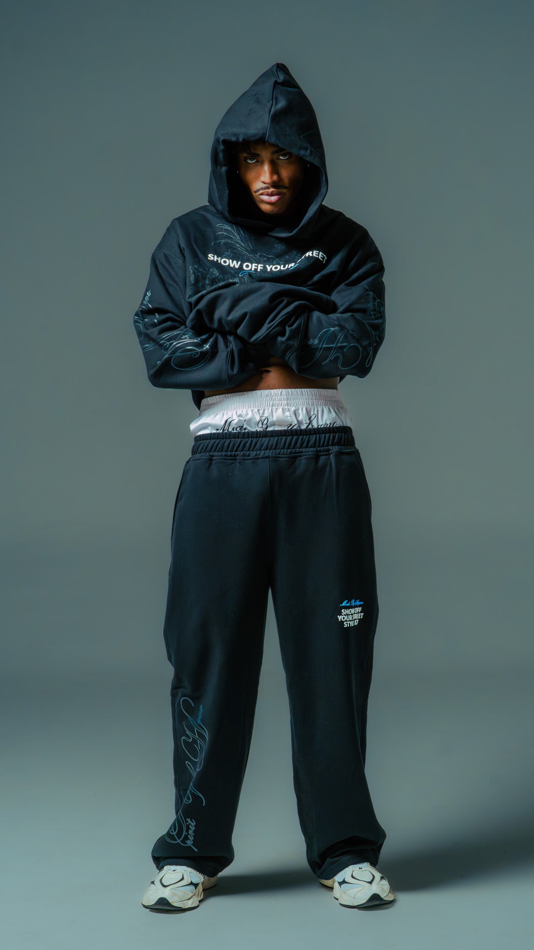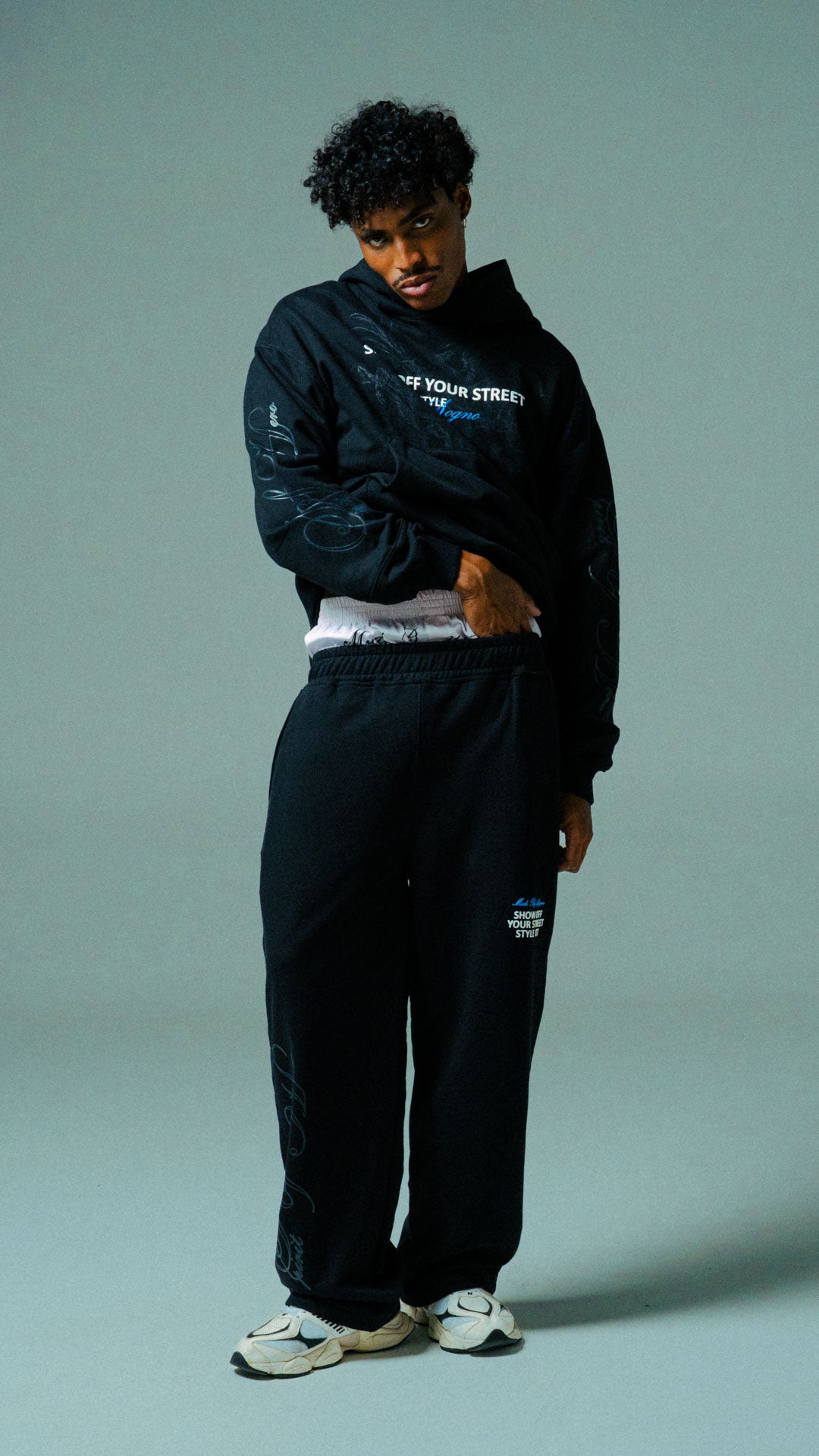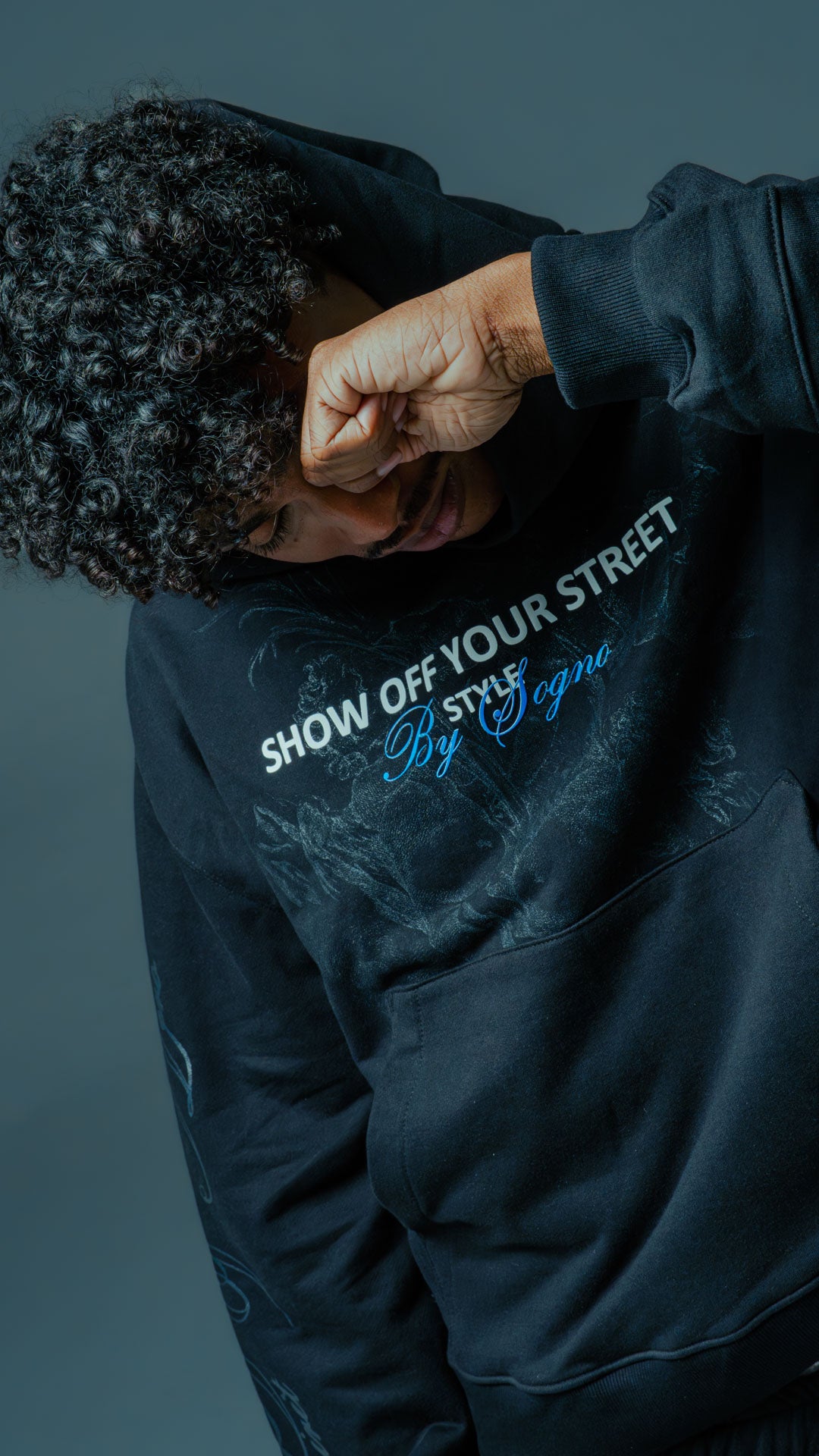 Buzo en burda unisex con chompa, lleva estampado en frente y espalda, lleva puños y fajones en rib.