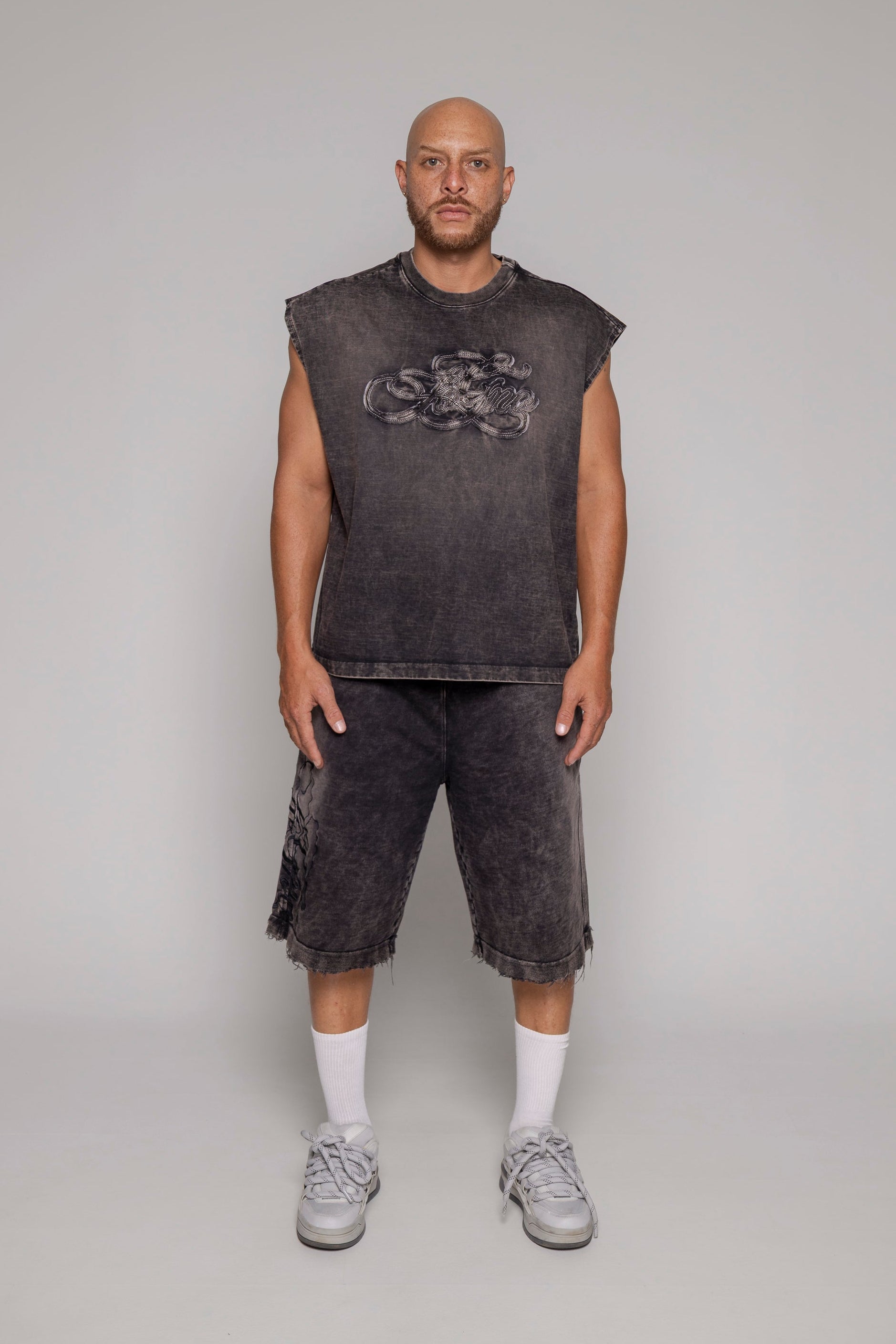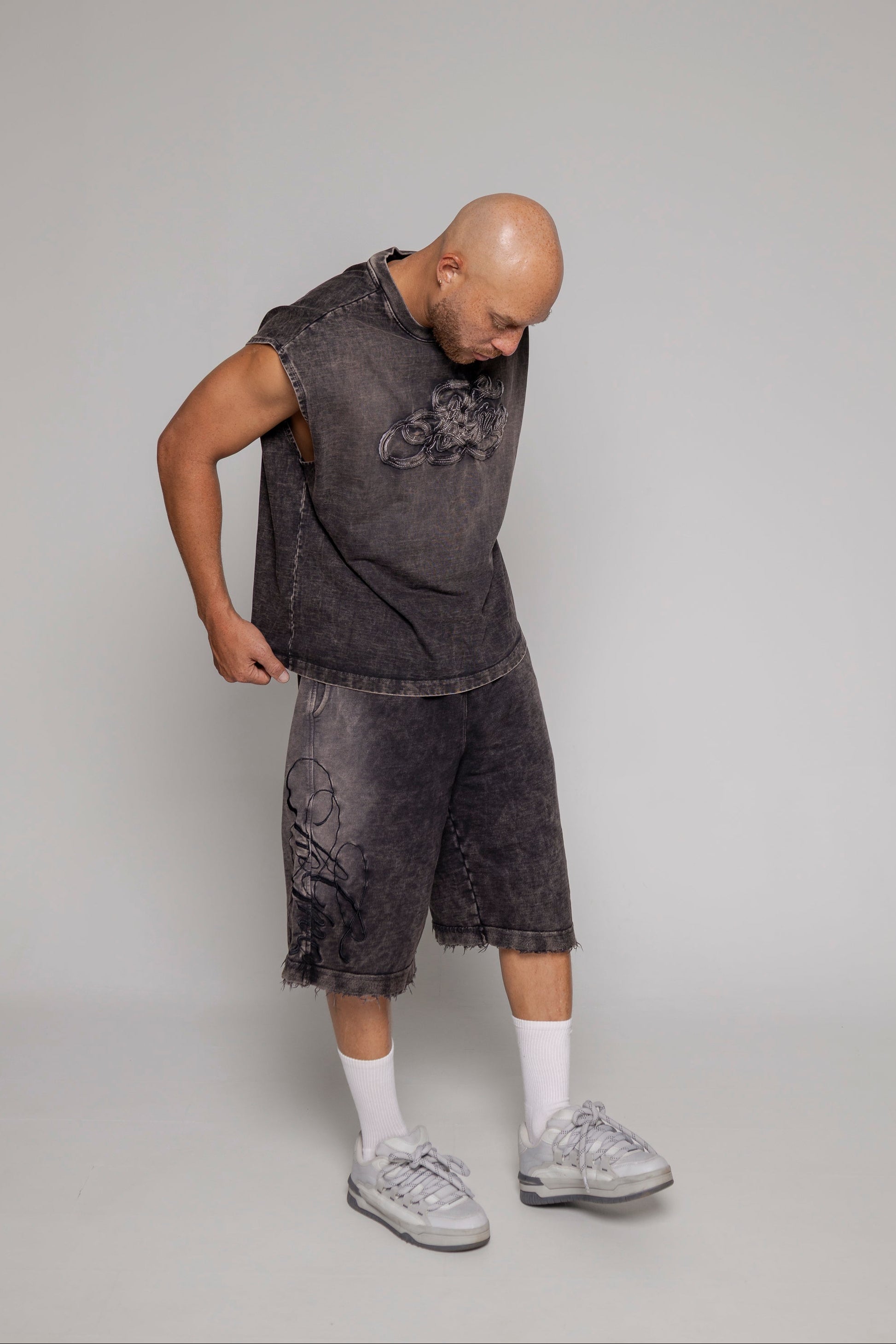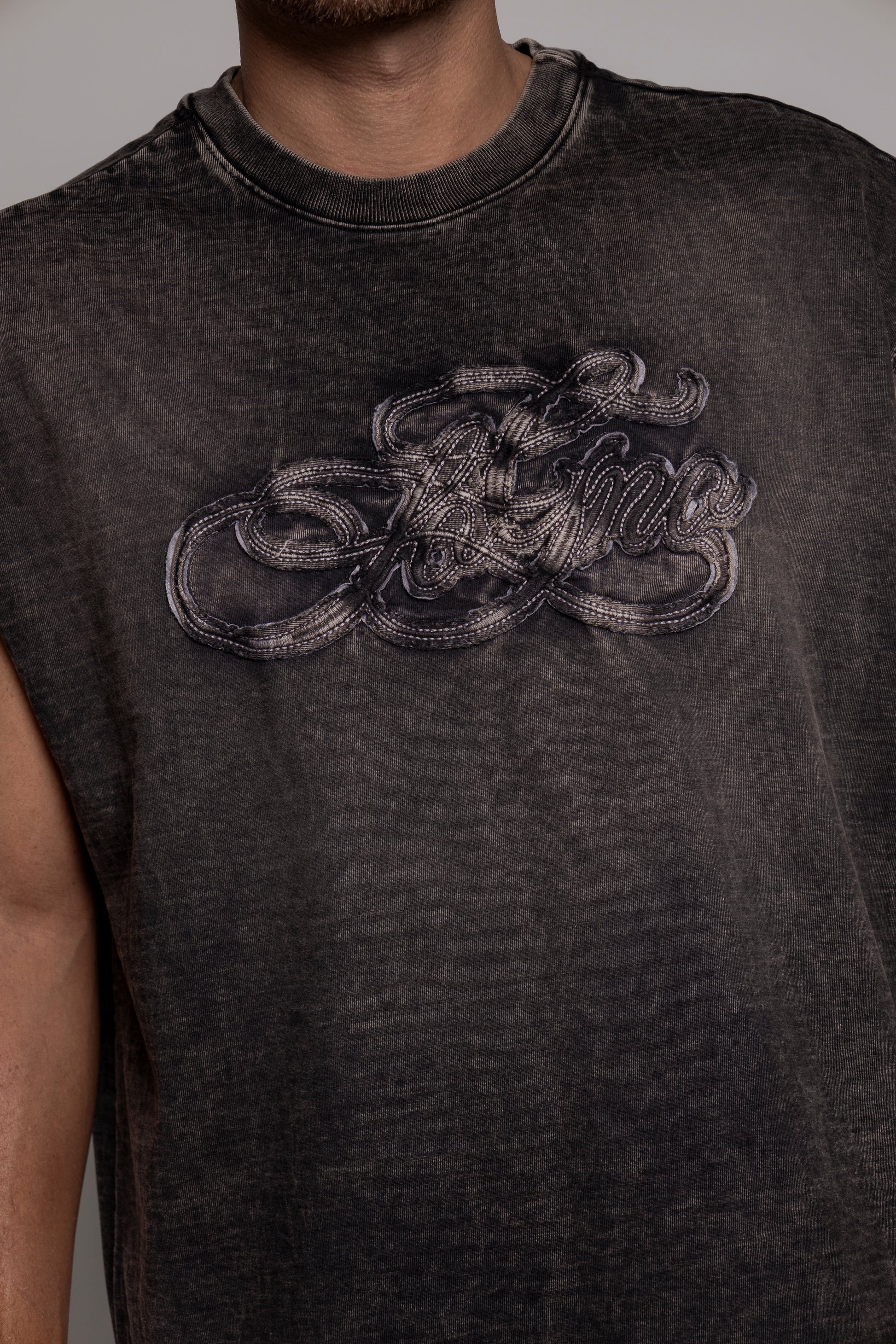 Camisilla en silueta oversized, tela 100% algodón, bordado en frente con aplique, proceso en lavandería.
