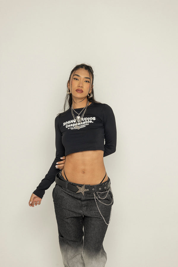 Disfruta de un look moderno y elegante con nuestro buzo cropped long colección Unspeakable . Con su color negro y estampado en frente, este top es perfecto para combinar con cargos, parachutes, jeans y pantalones.
