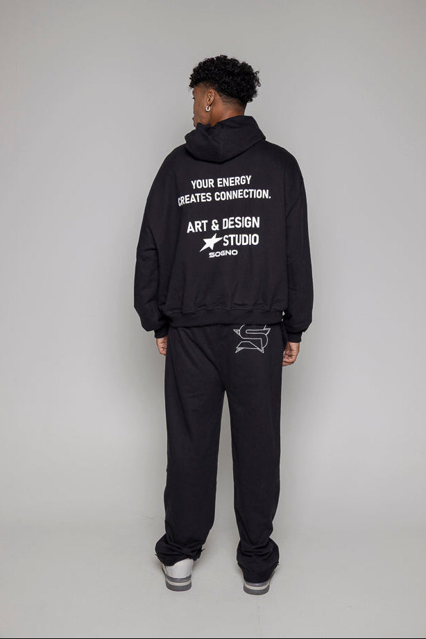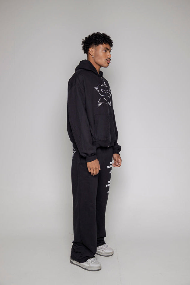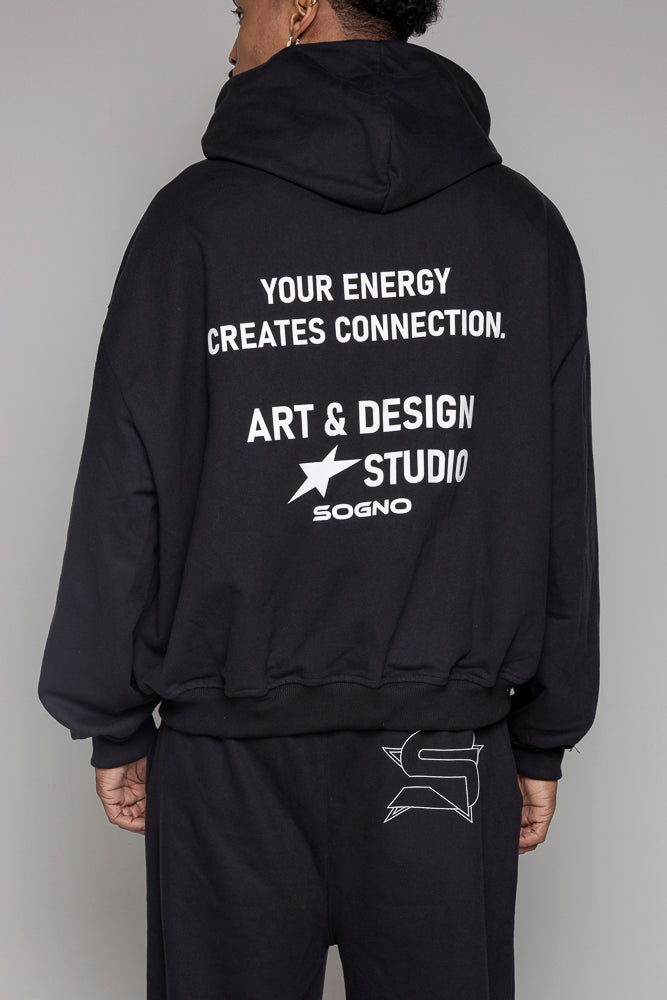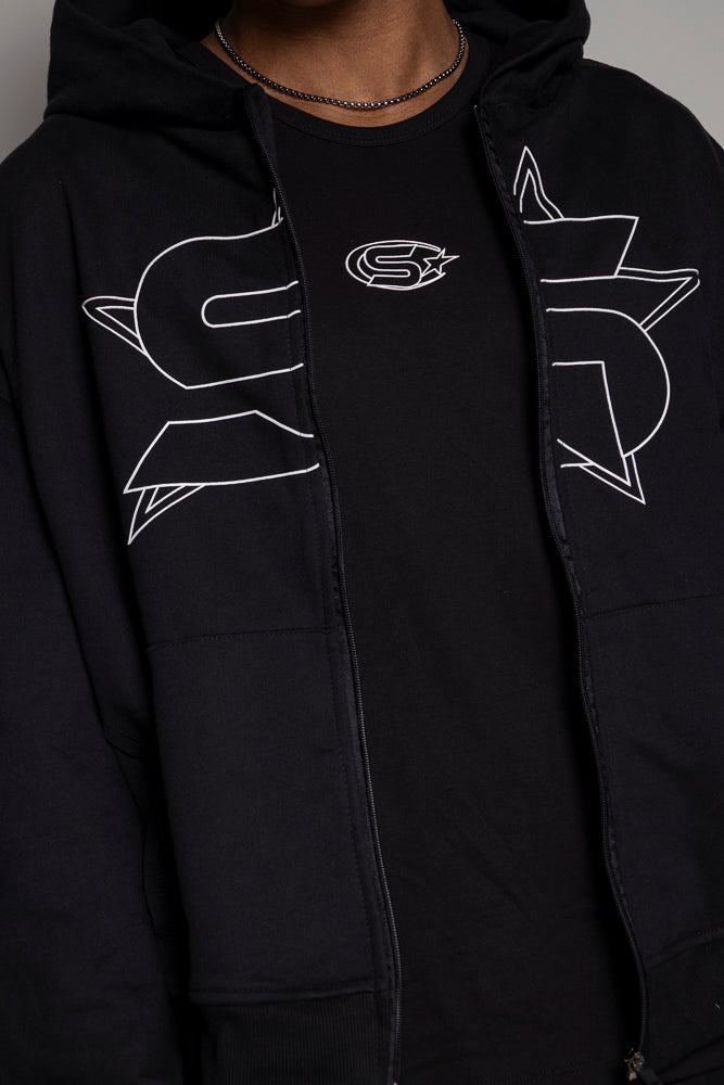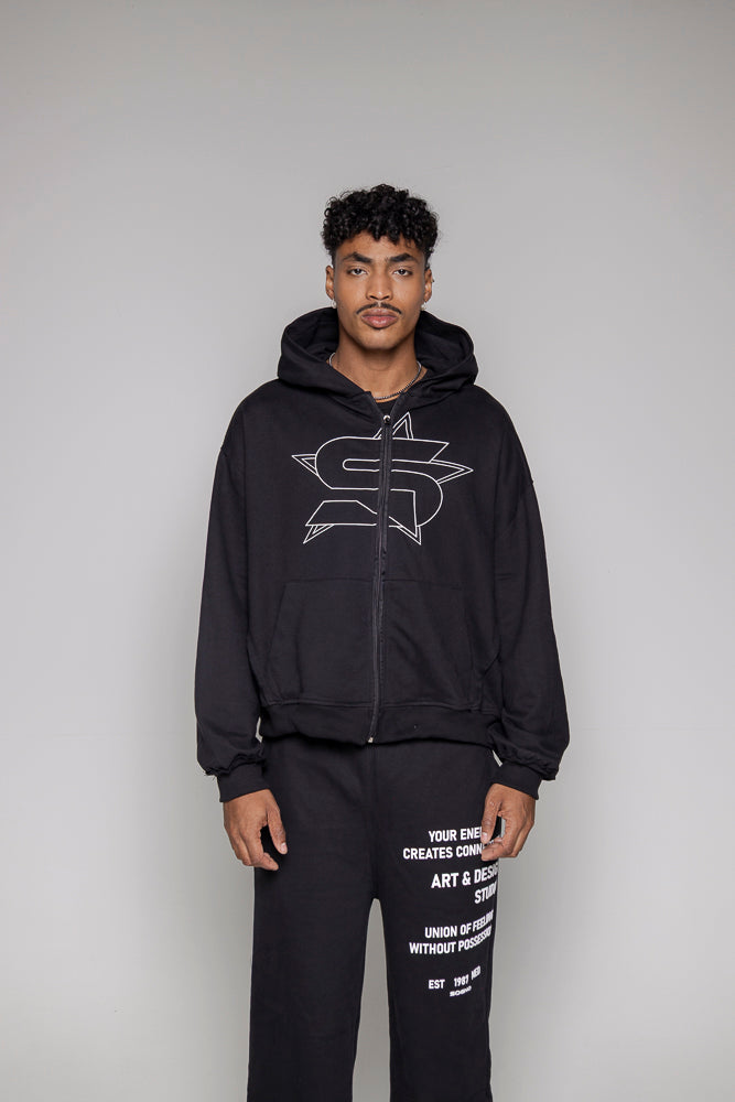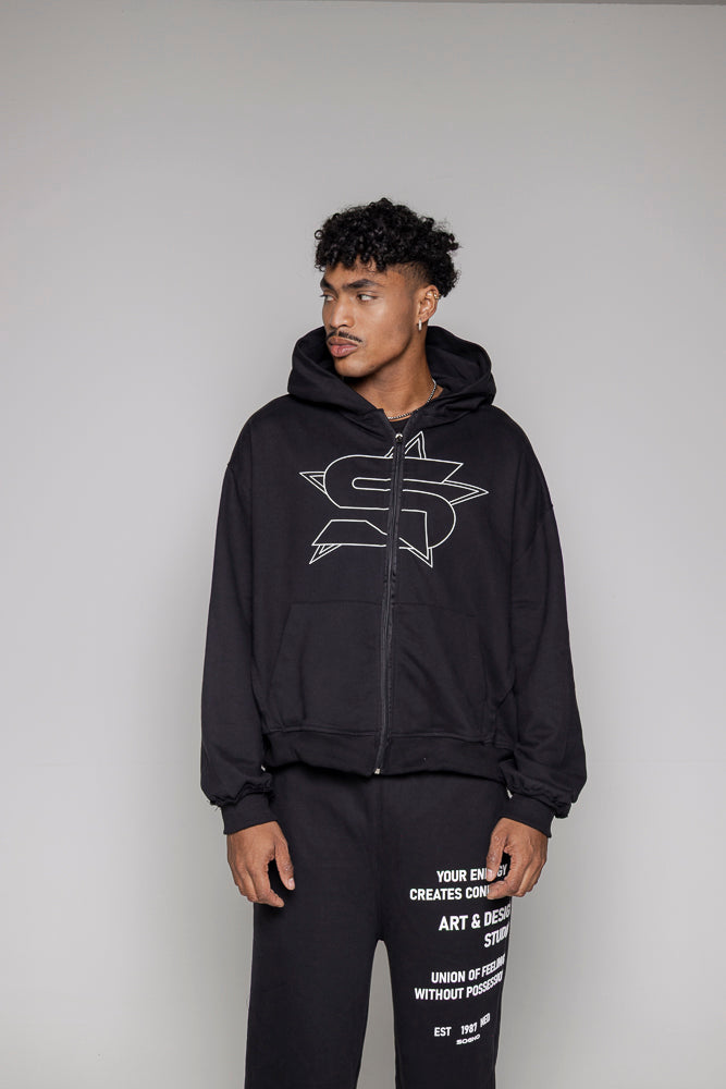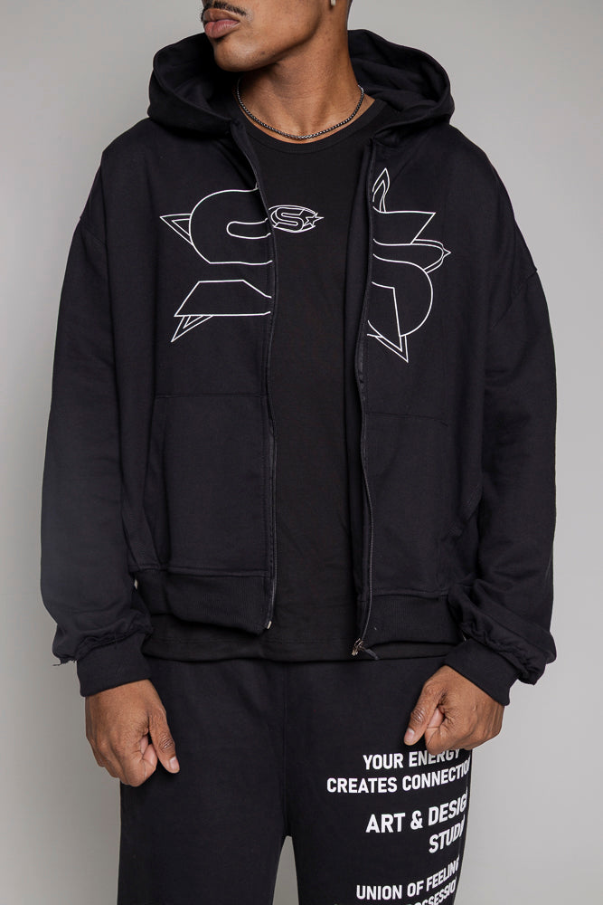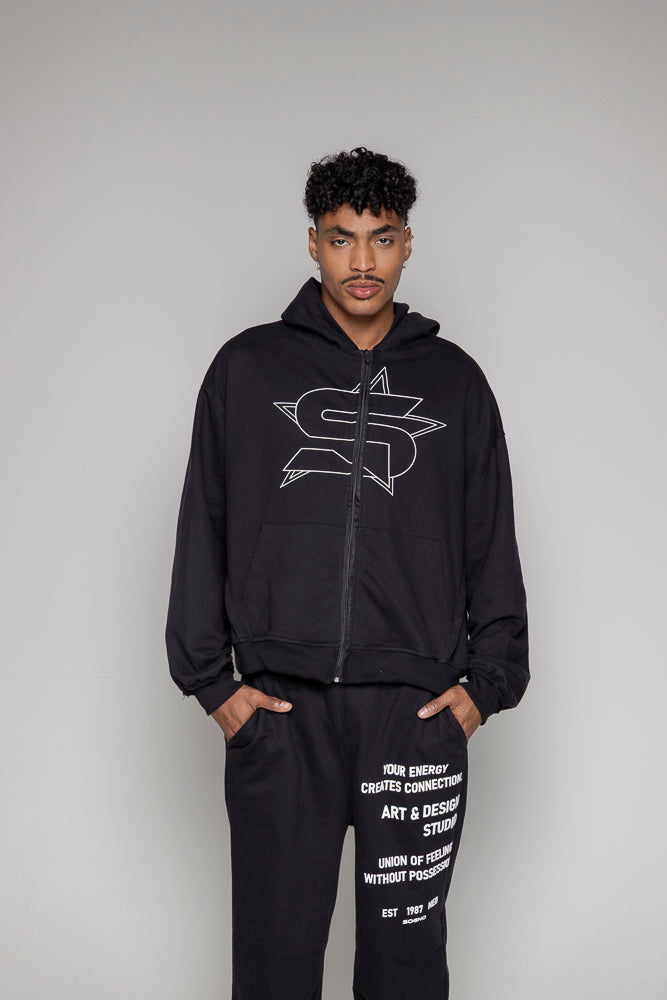 Buzo en burda unisex con cierre y chompa, lleva estampado en frente y espalda, lleva puños y fajones en rib.