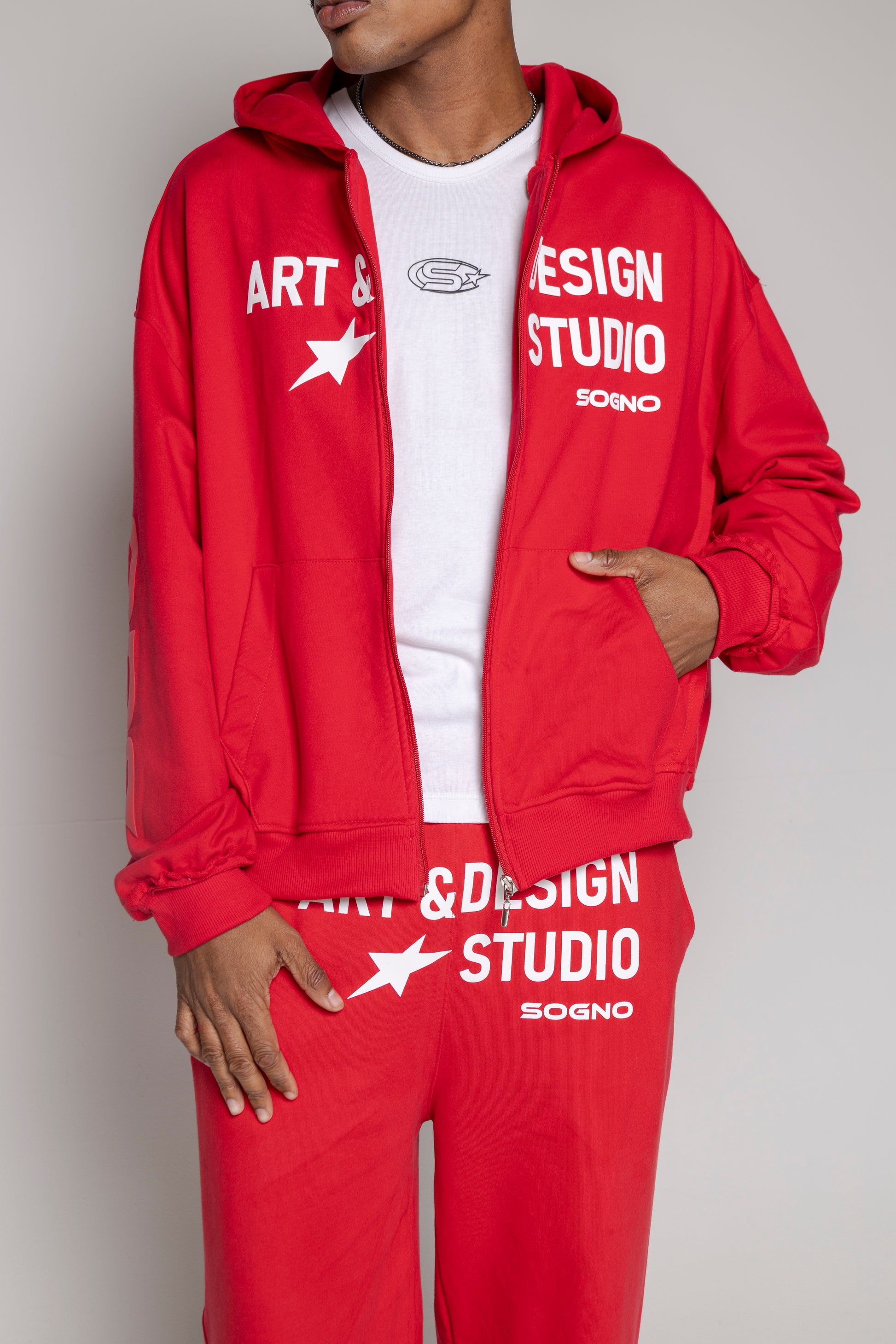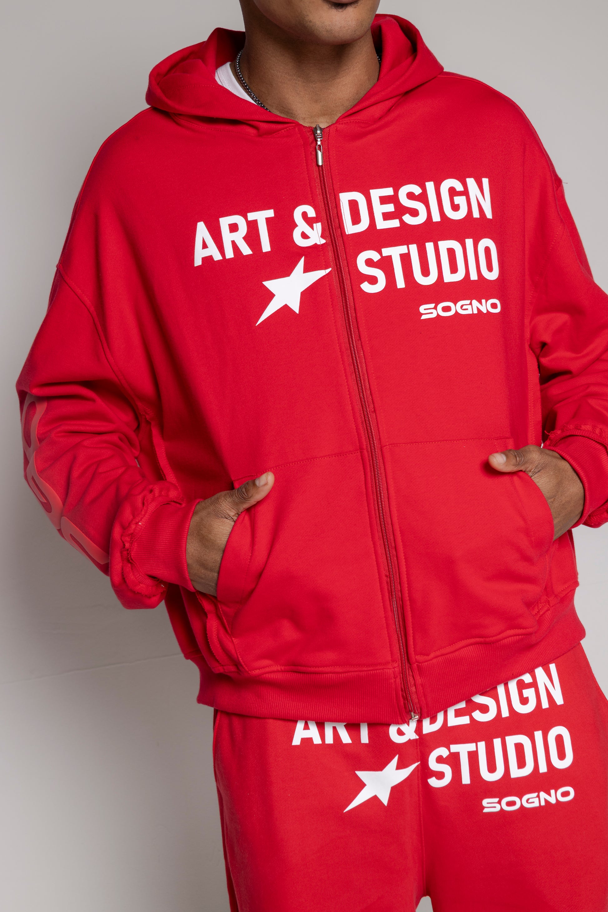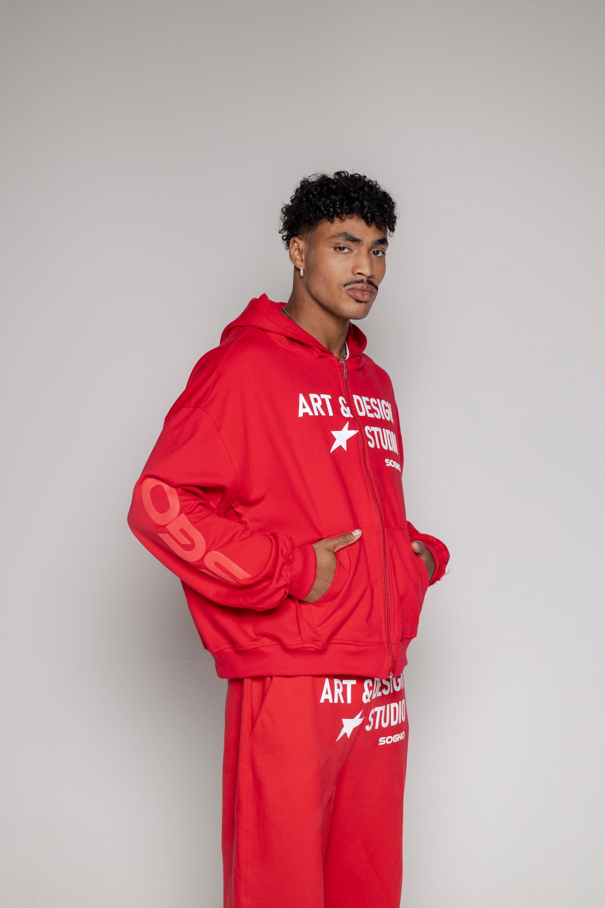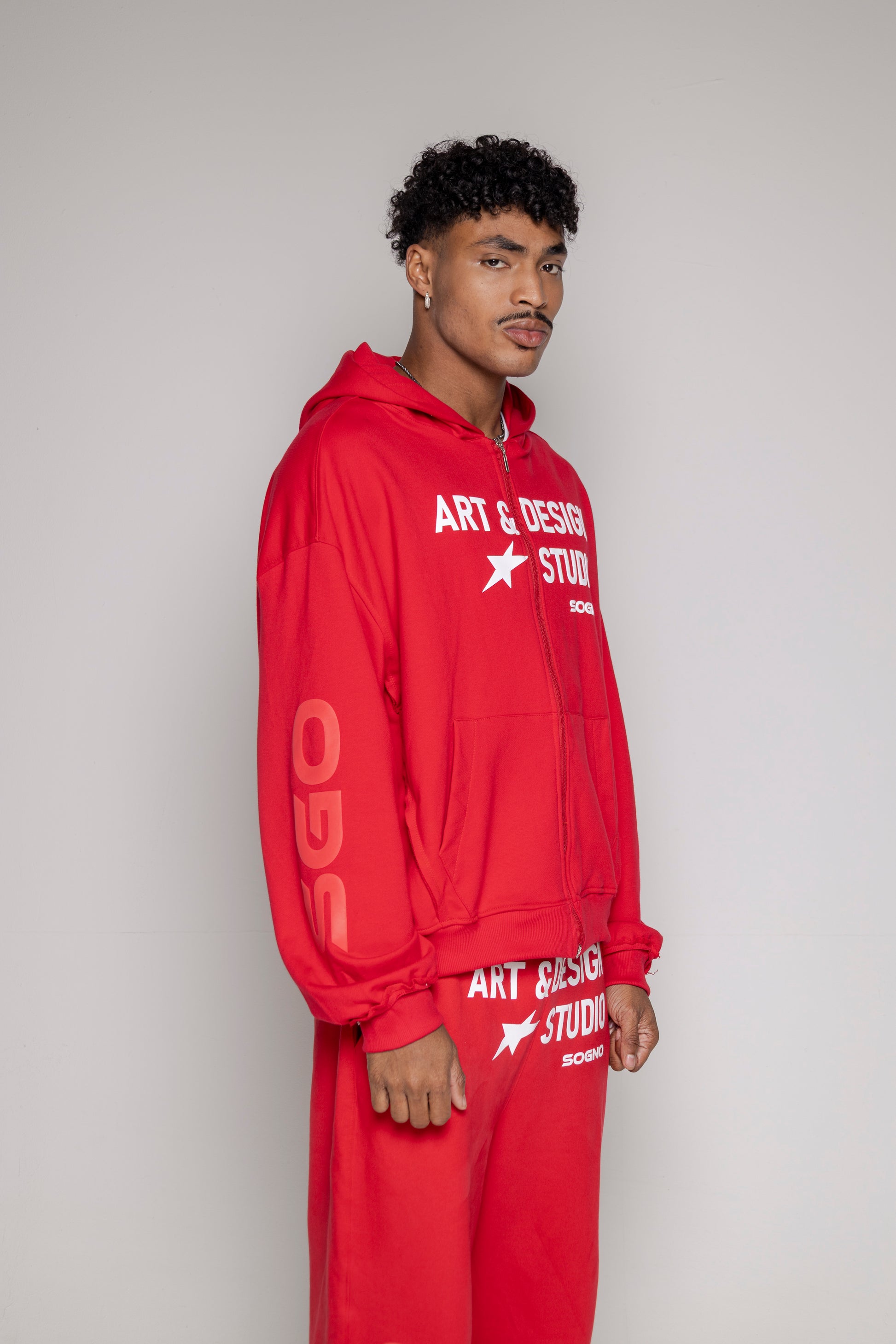 Buzo en burda unisex con cierre y chompa, lleva estampado en frente y espalda, lleva puños y fajones en rib.