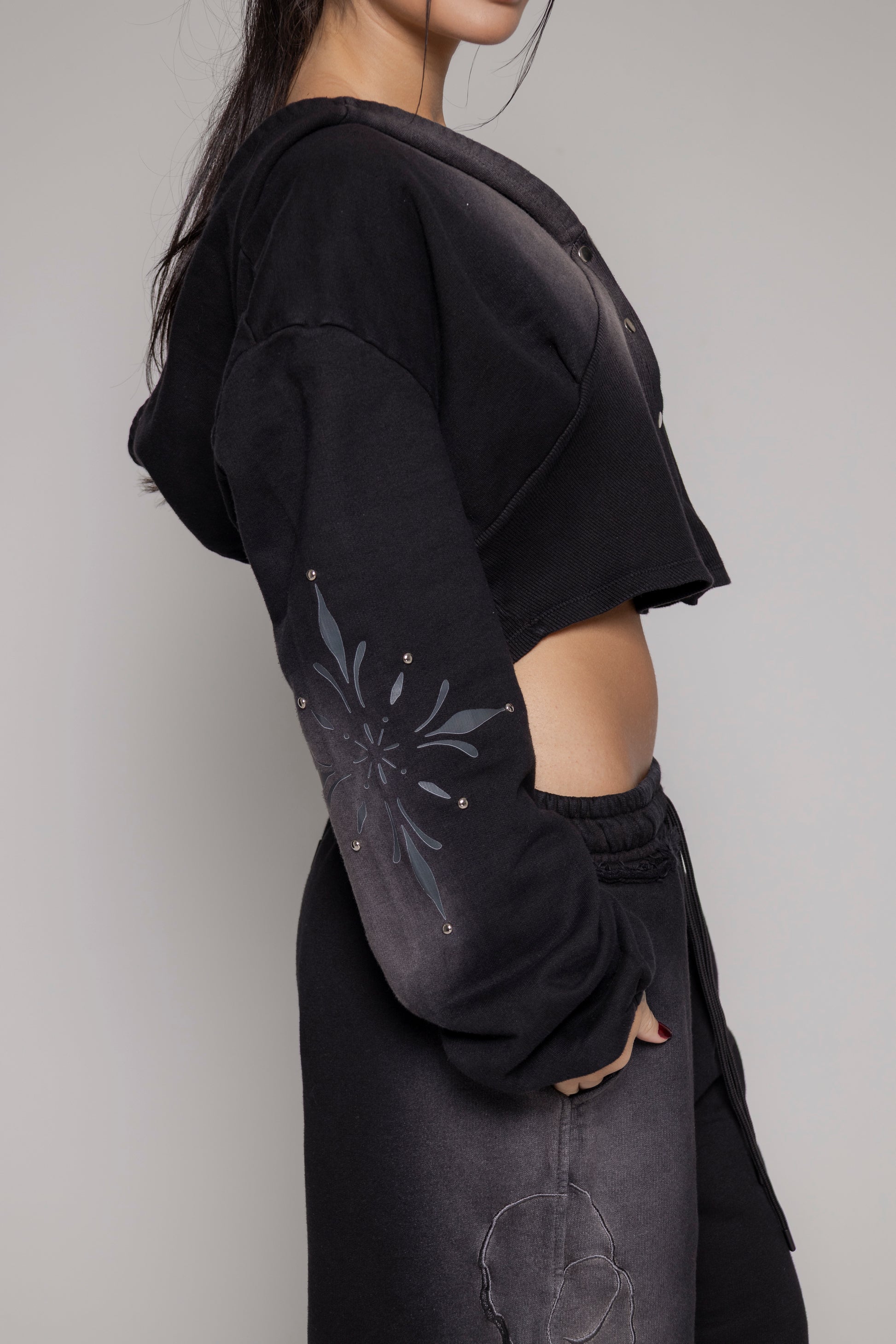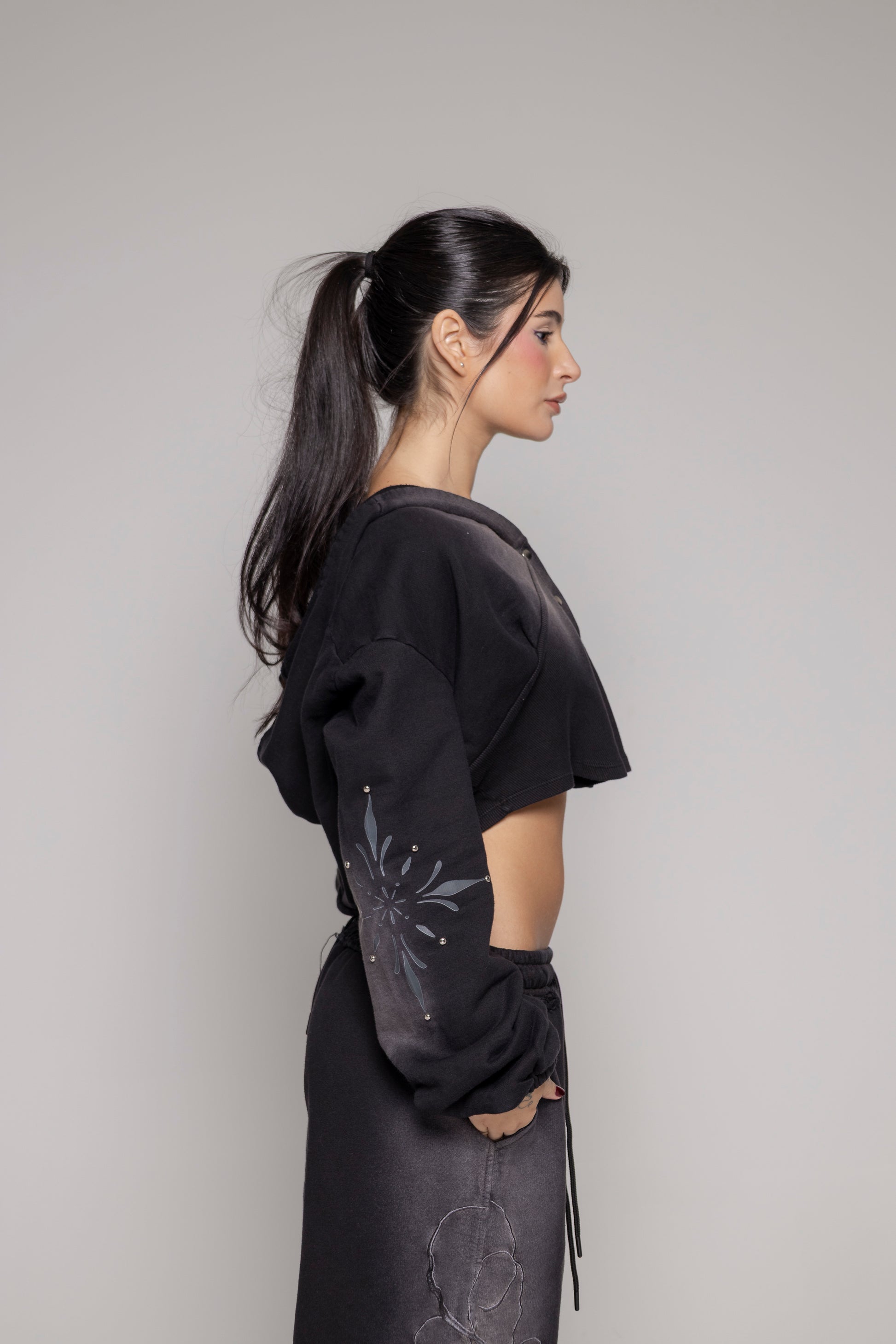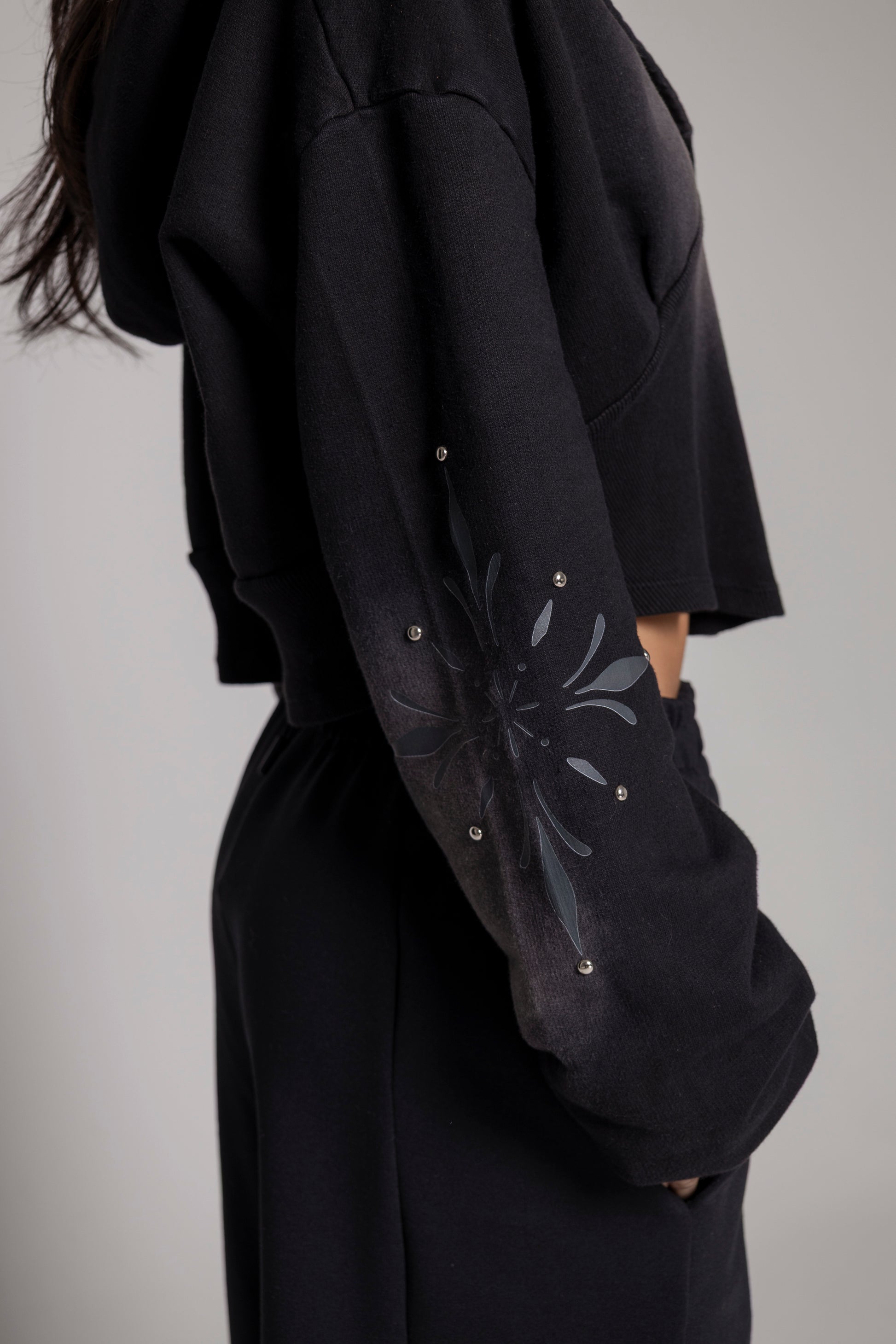 Este buzo corte en v de burda incluye una chompa y presenta estampados tanto en la parte frontal como en las mangas con taches. Está hecho con puños y fajones en tejido rib para mayor comodidad y ajuste.