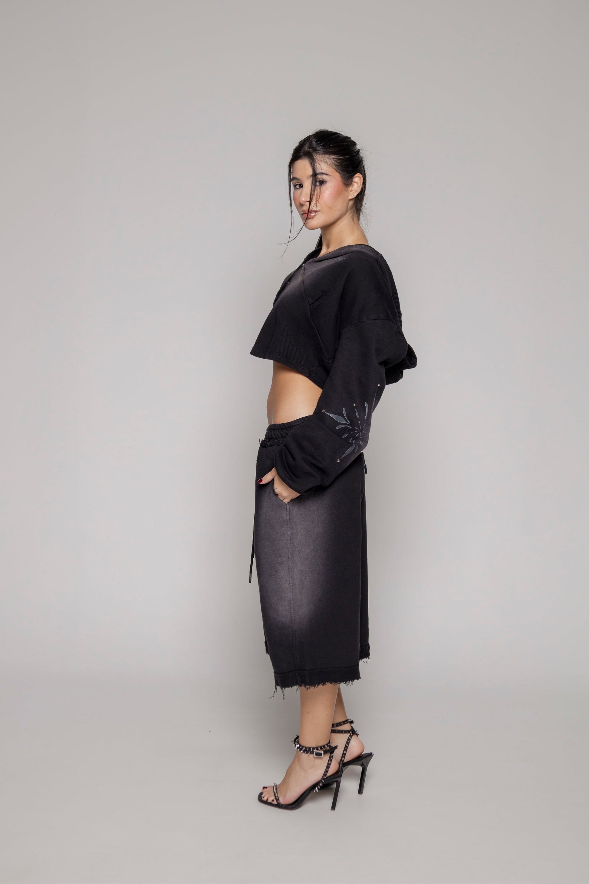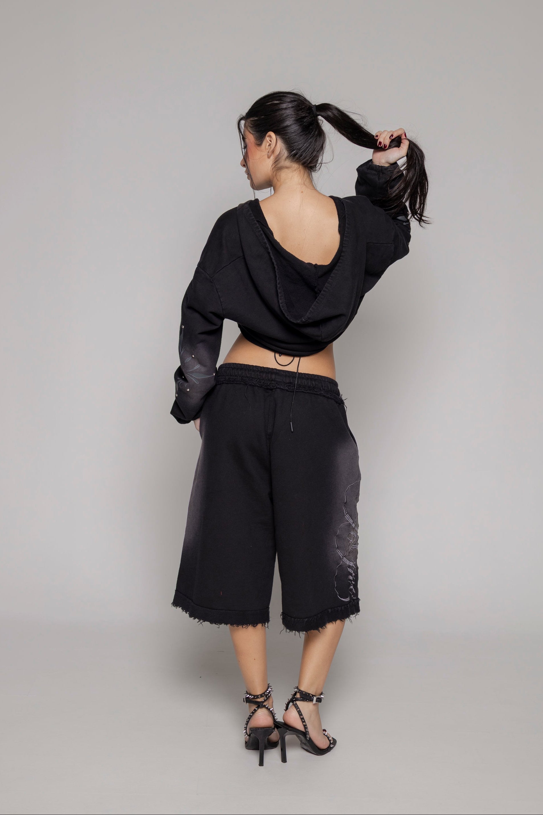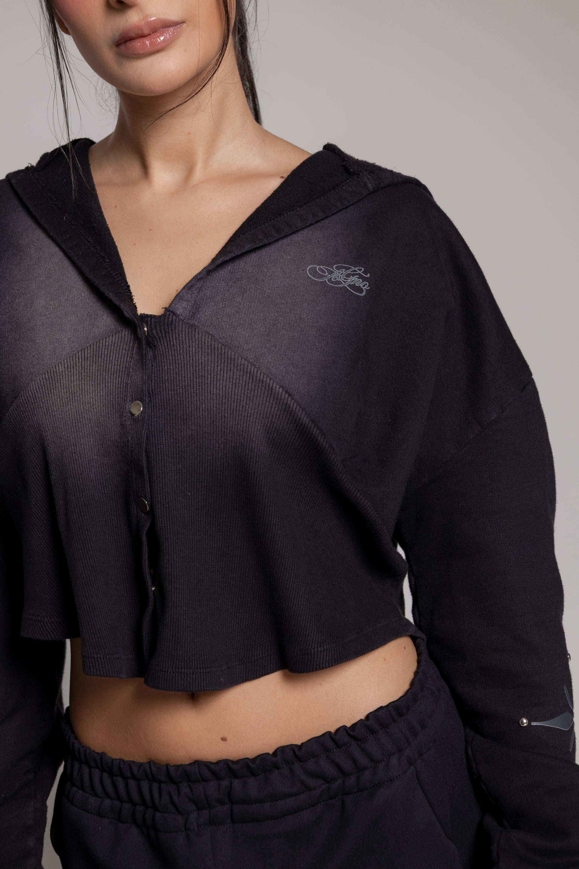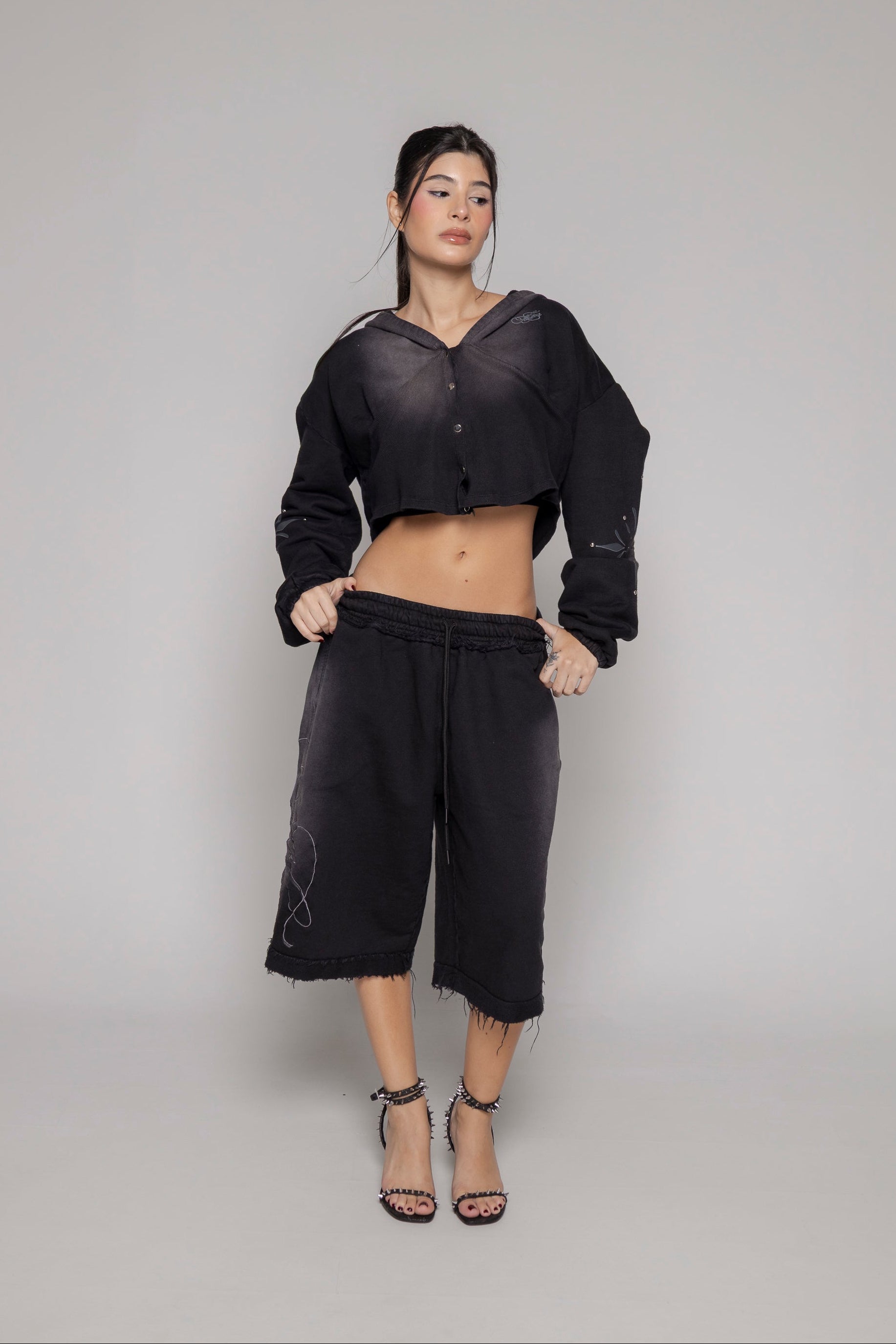 Este buzo corte en v de burda incluye una chompa y presenta estampados tanto en la parte frontal como en las mangas con taches. Está hecho con puños y fajones en tejido rib para mayor comodidad y ajuste.