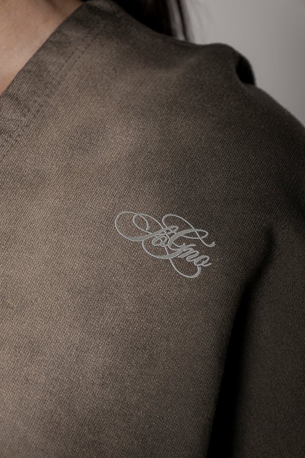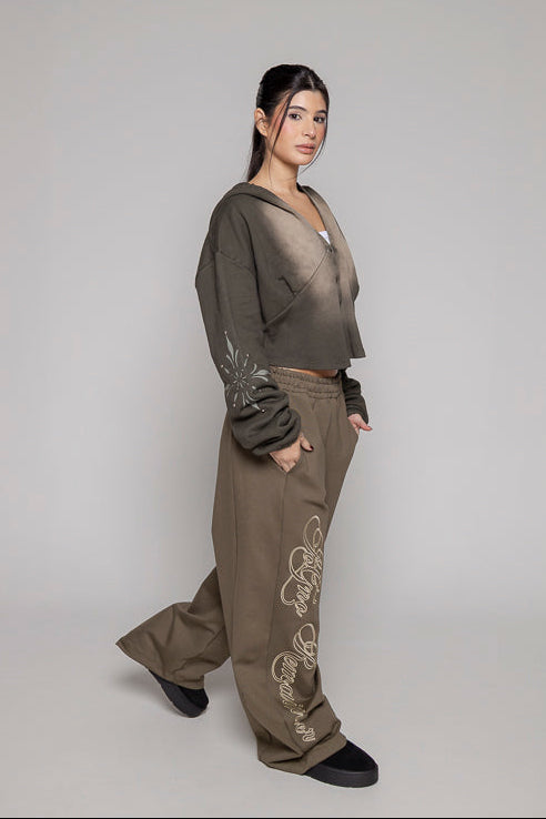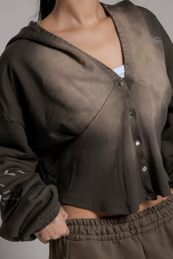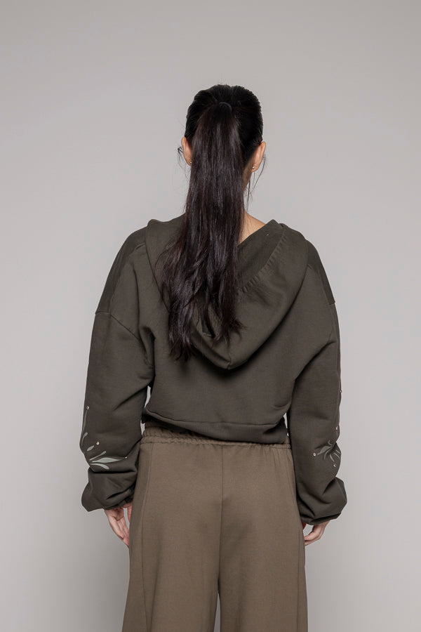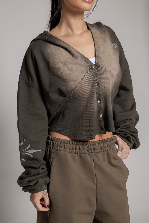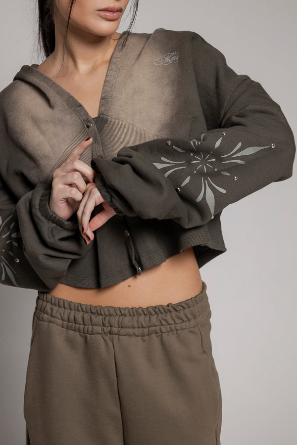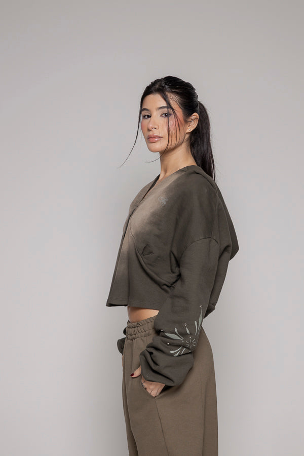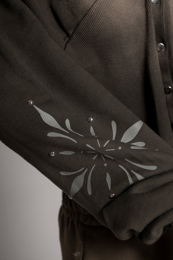 Este buzo corte en v de burda incluye una chompa y presenta estampados tanto en la parte frontal como en las mangas con taches. Está hecho con puños y fajones en tejido rib para mayor comodidad y ajuste.