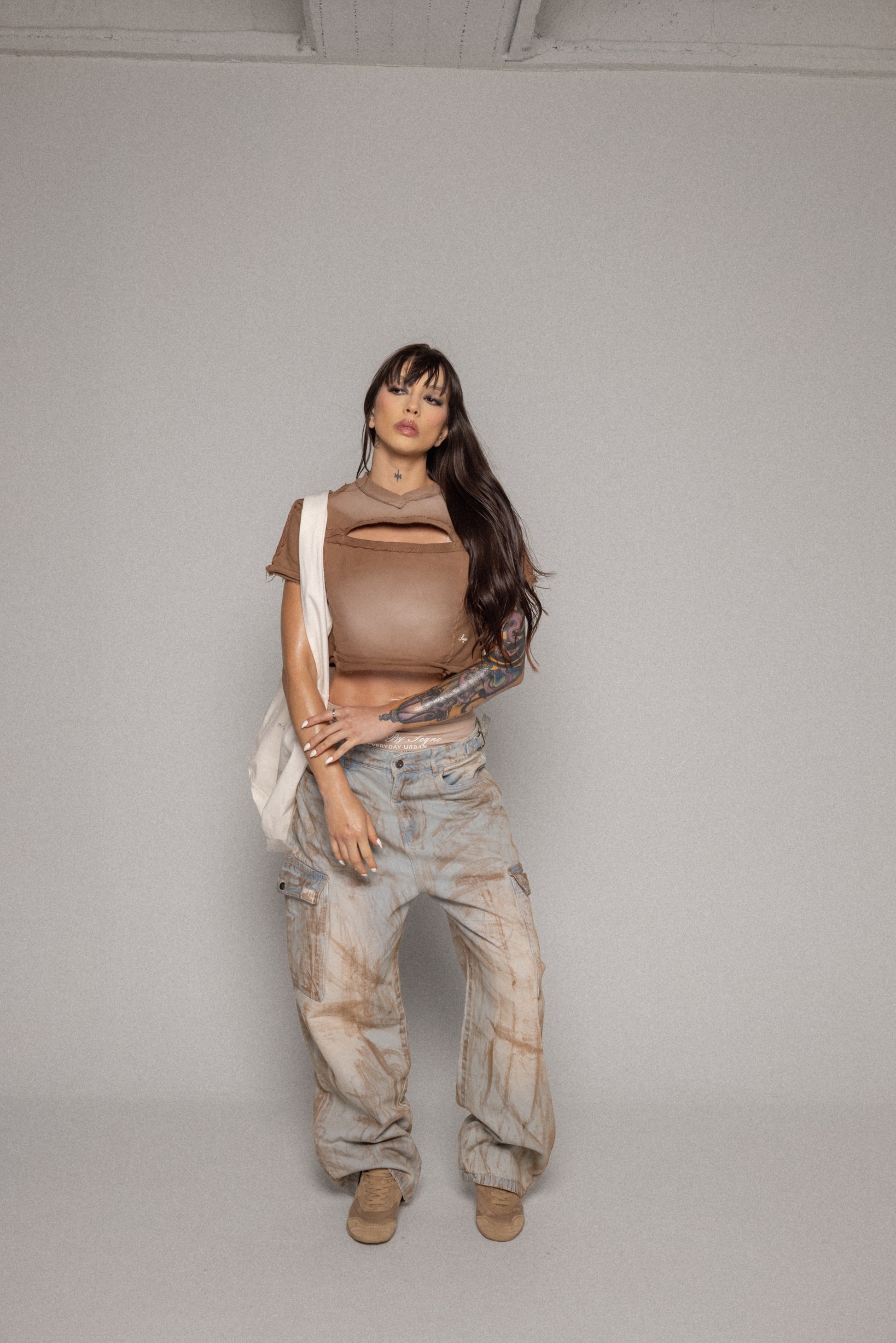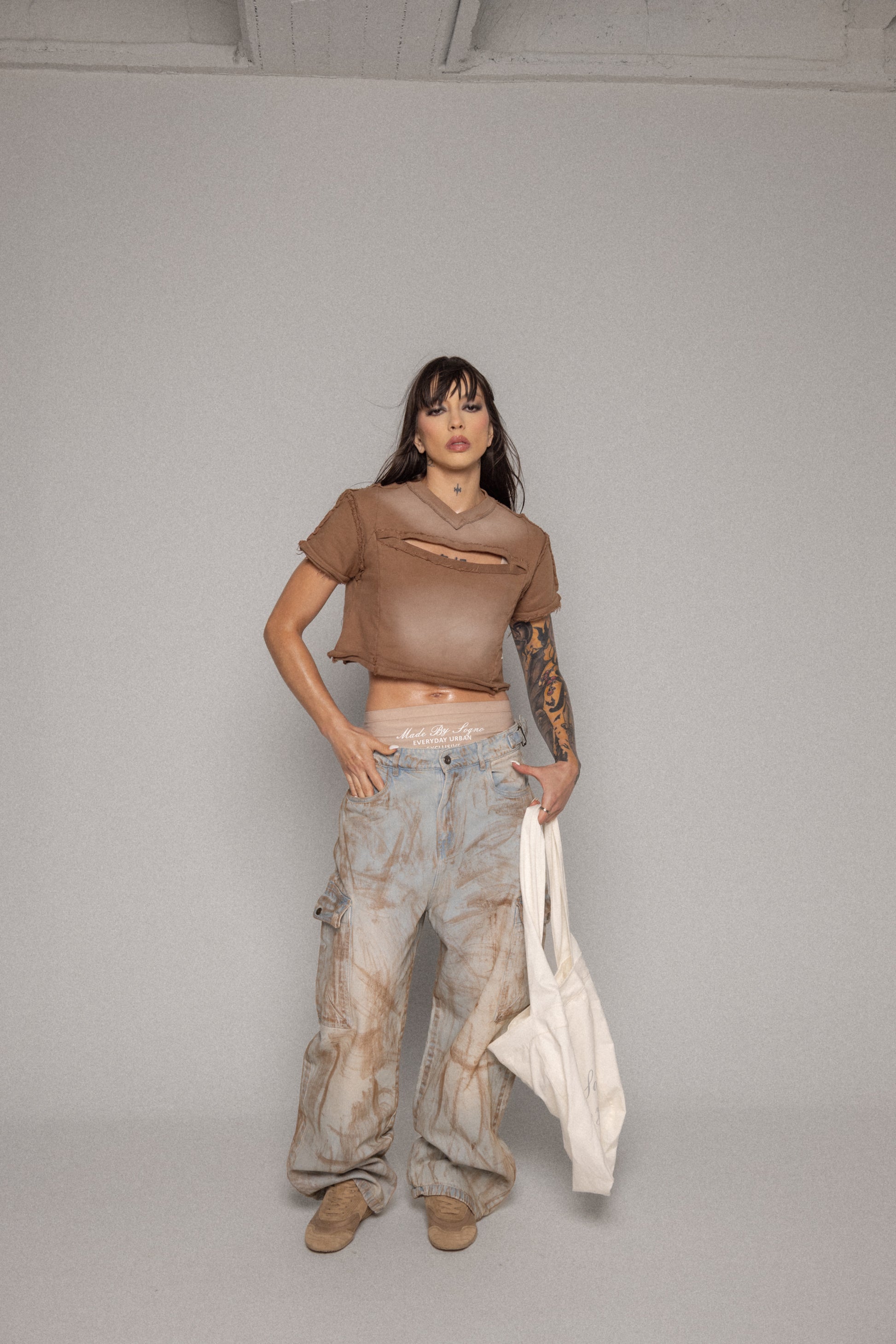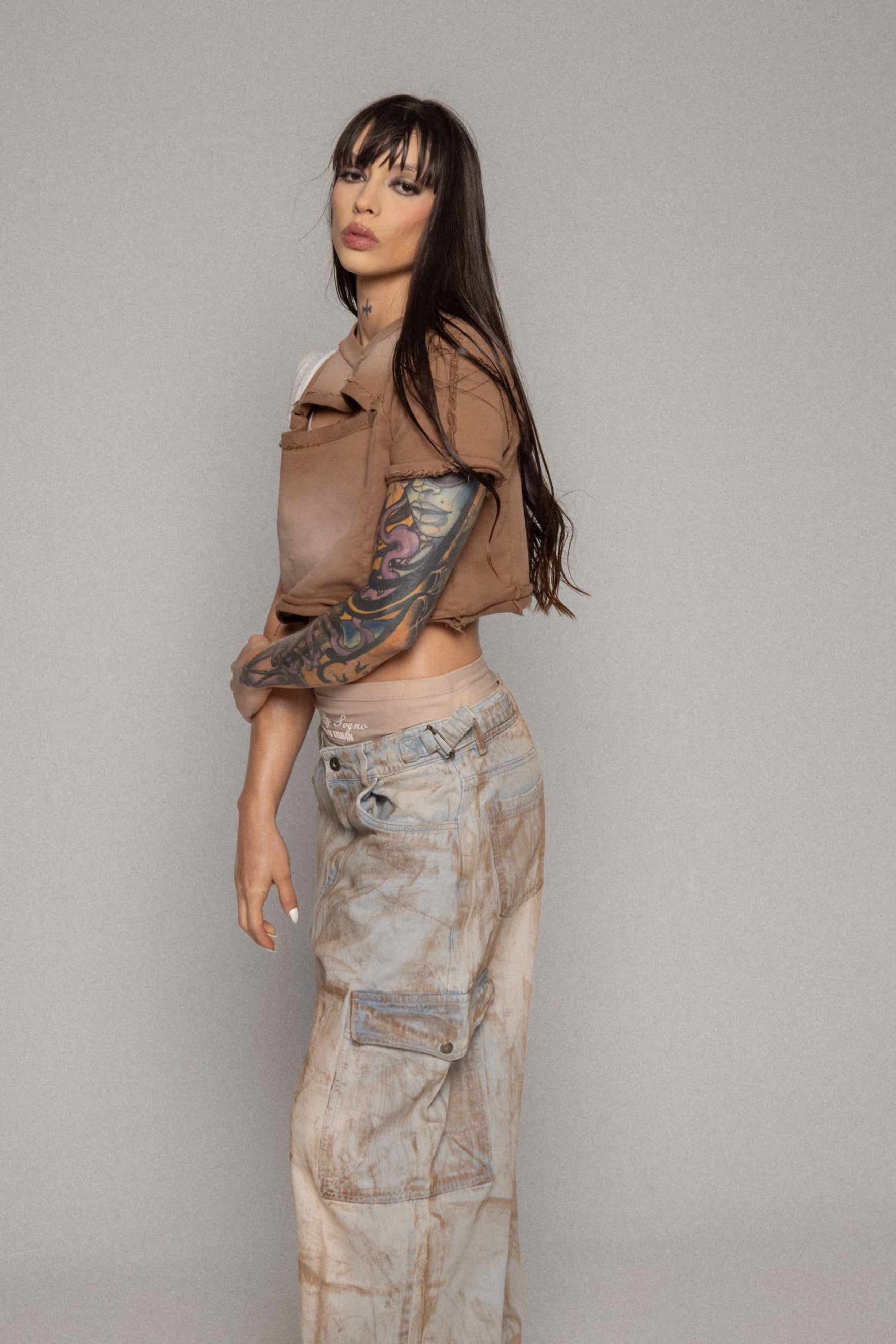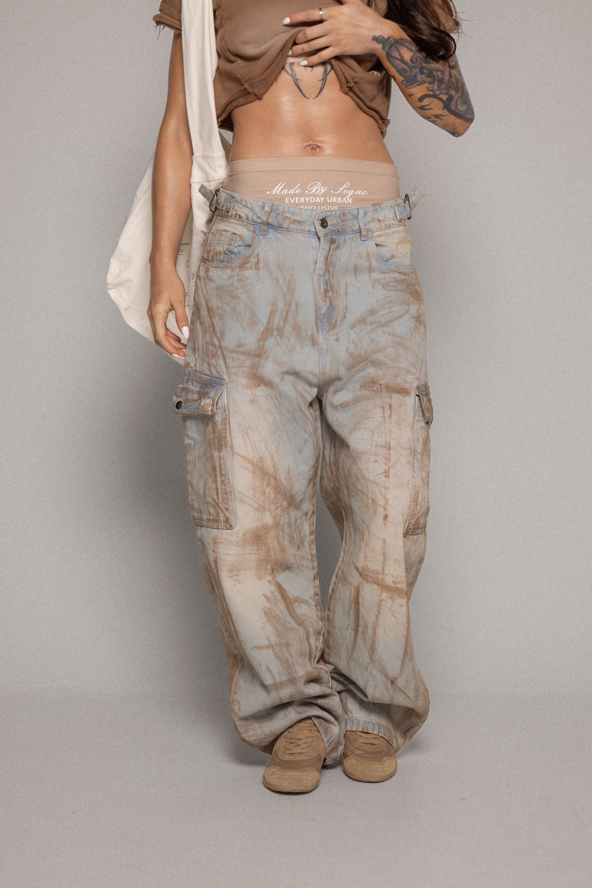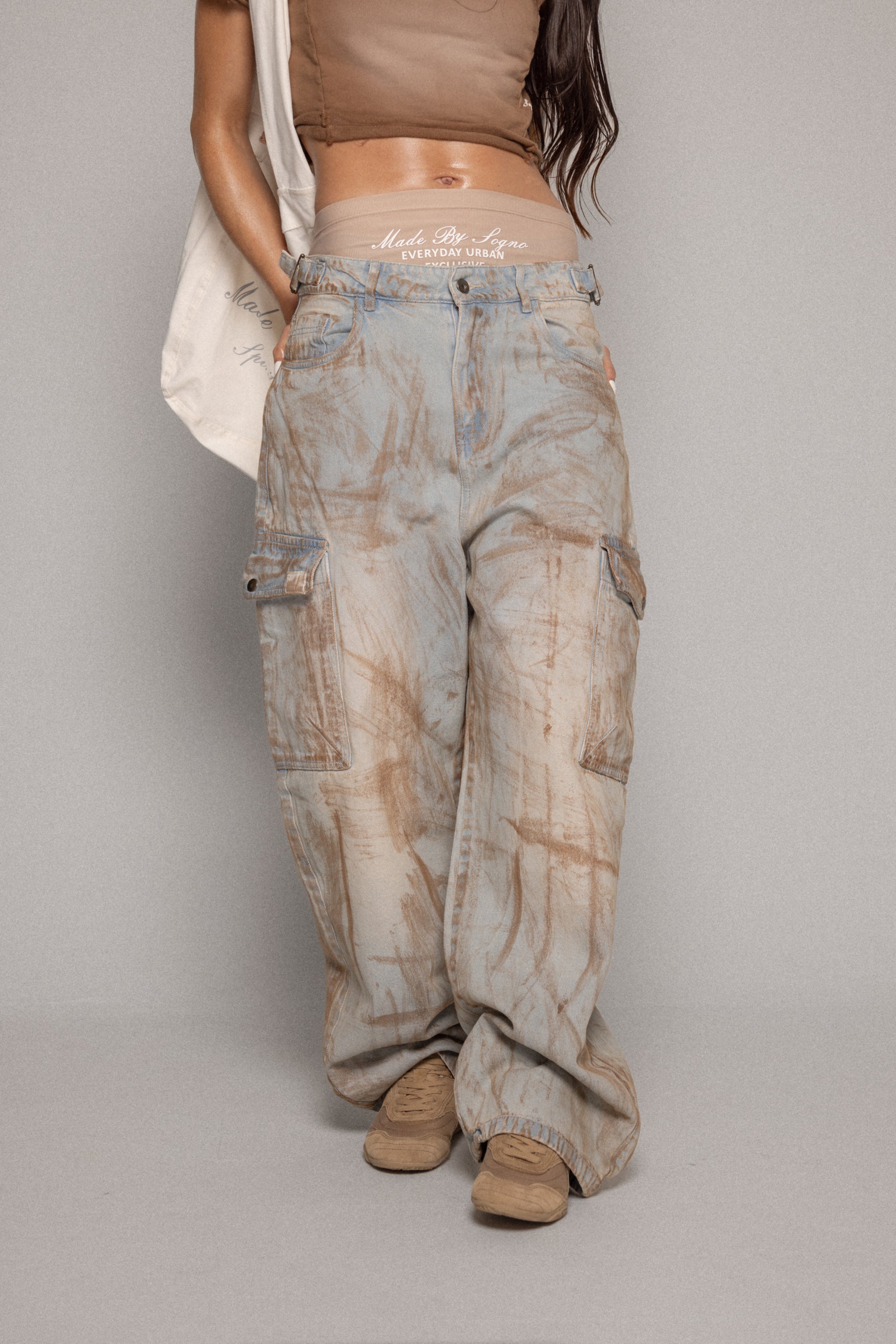Jean cargo horma wide leg tiro alto, lavado azul con engrasado café , lleva pasadores para ajustar en cintura con hebillas, bolsillo tipo cargo con banderin sogno en tapa.