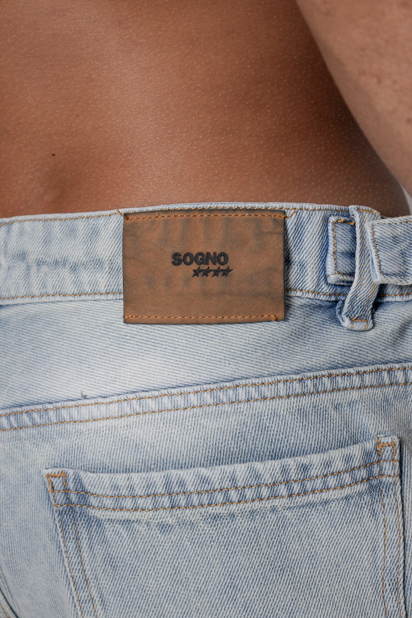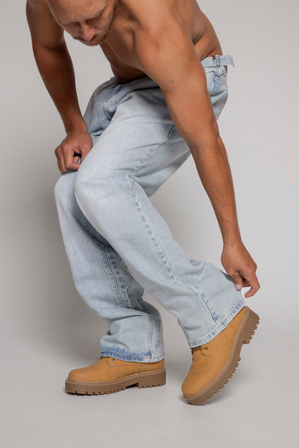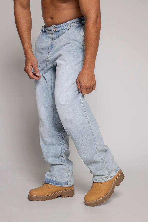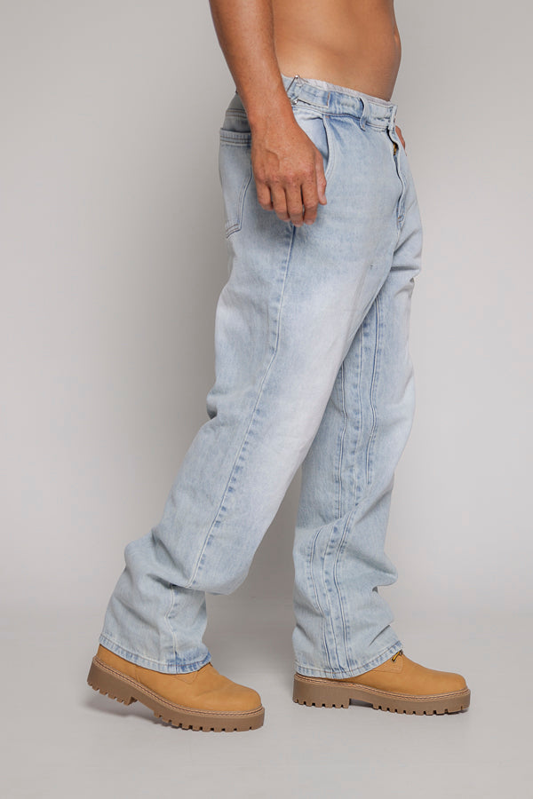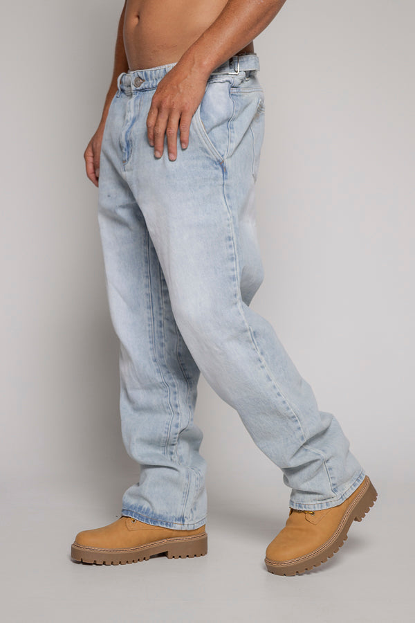 Este jean unisex en color azul claro presenta un diseño básico. Cuenta con cortes laterales tanto en la parte frontal como trasera, y la pretina incluye pasadores que permiten ajustar la cintura para un mejor ajuste.