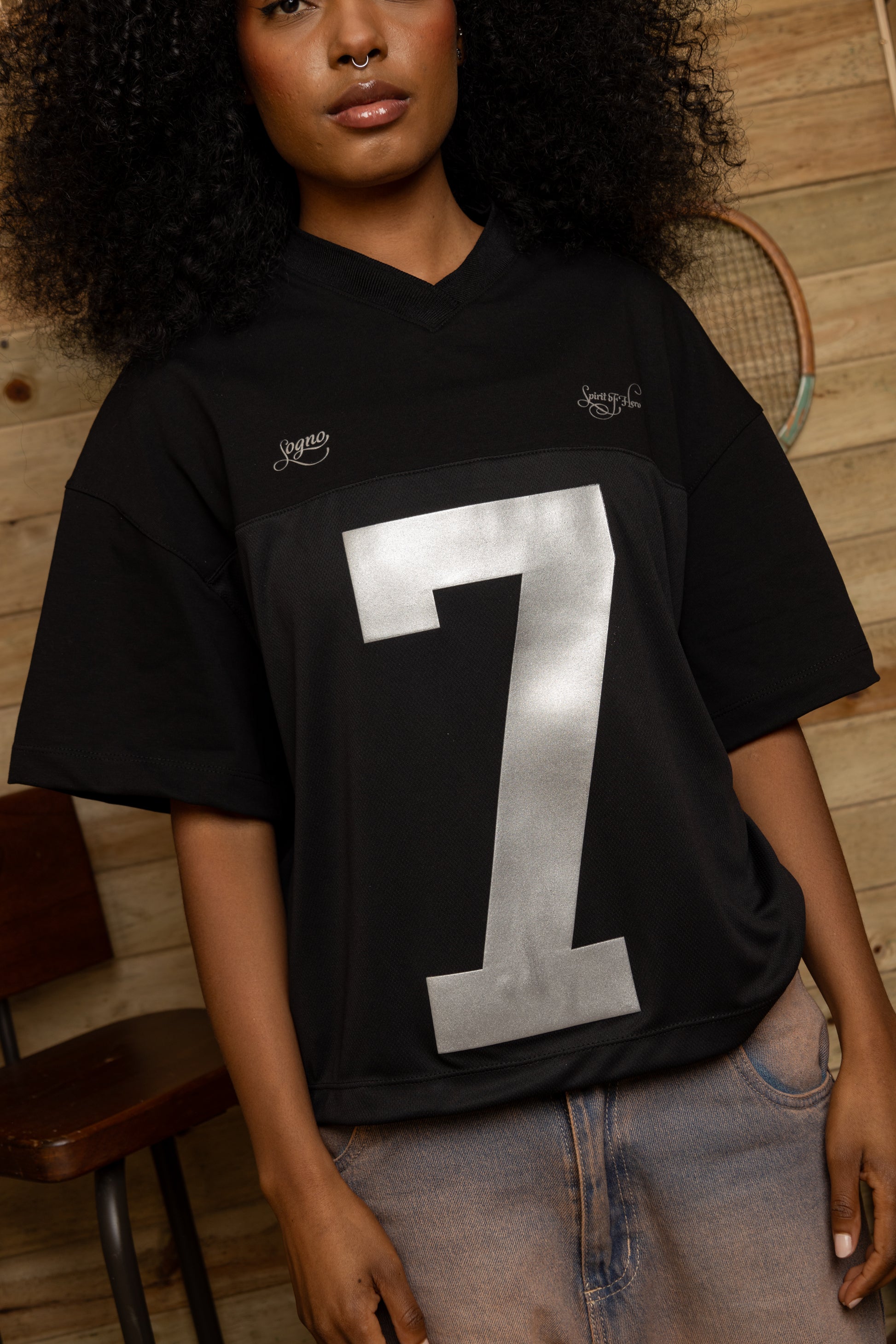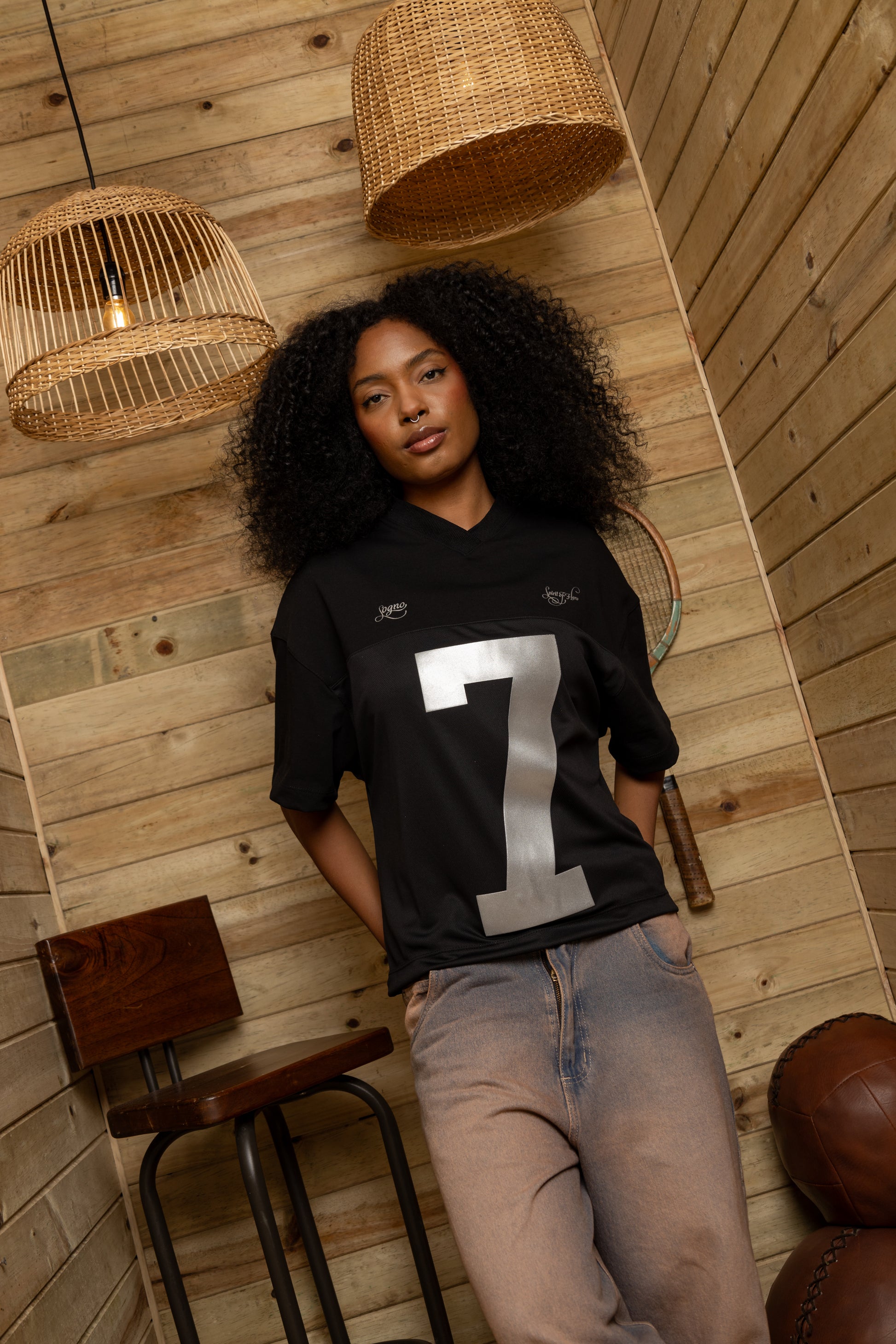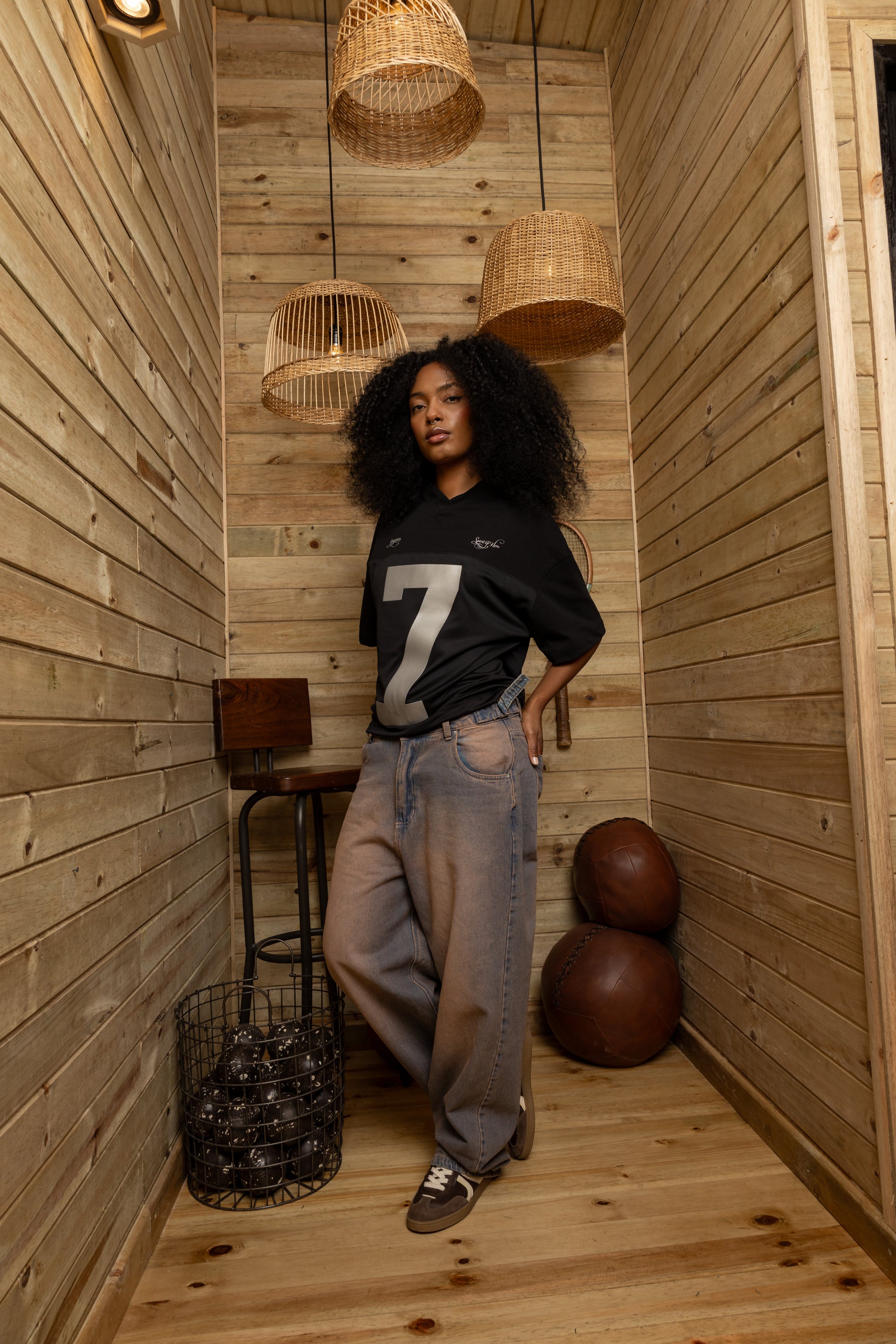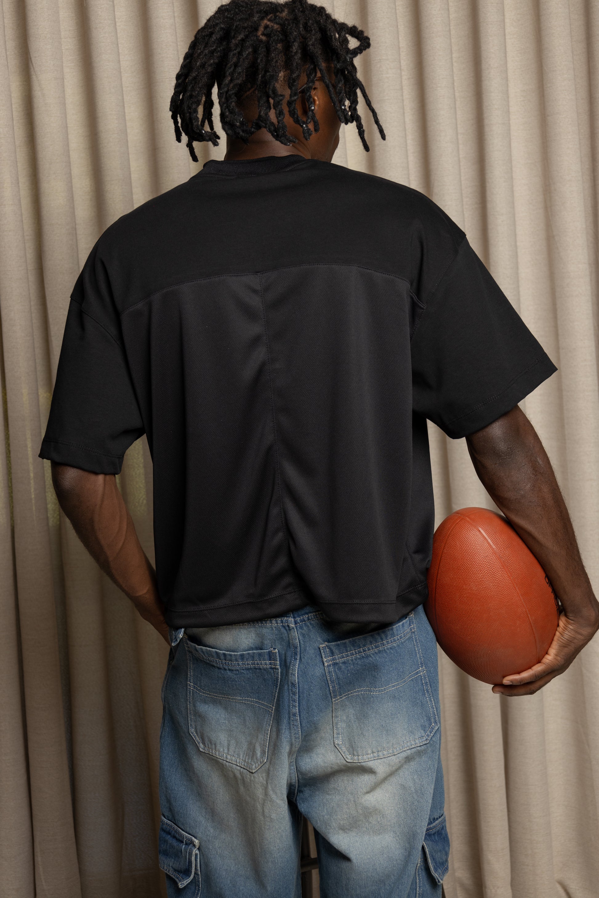 Oversized silueta boxy fit cuello en V, con corte en frente y espalda en malla, estampado en frente.