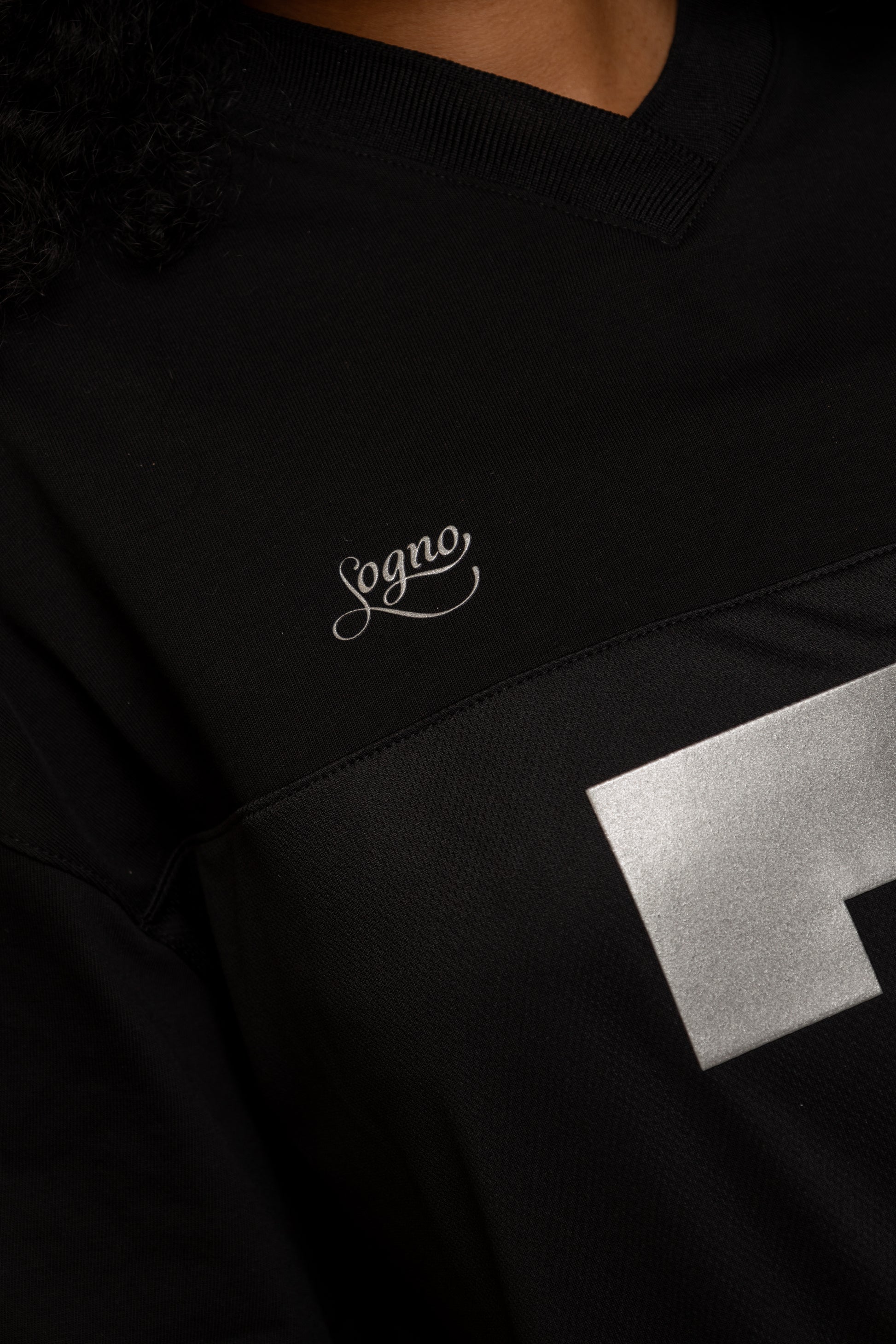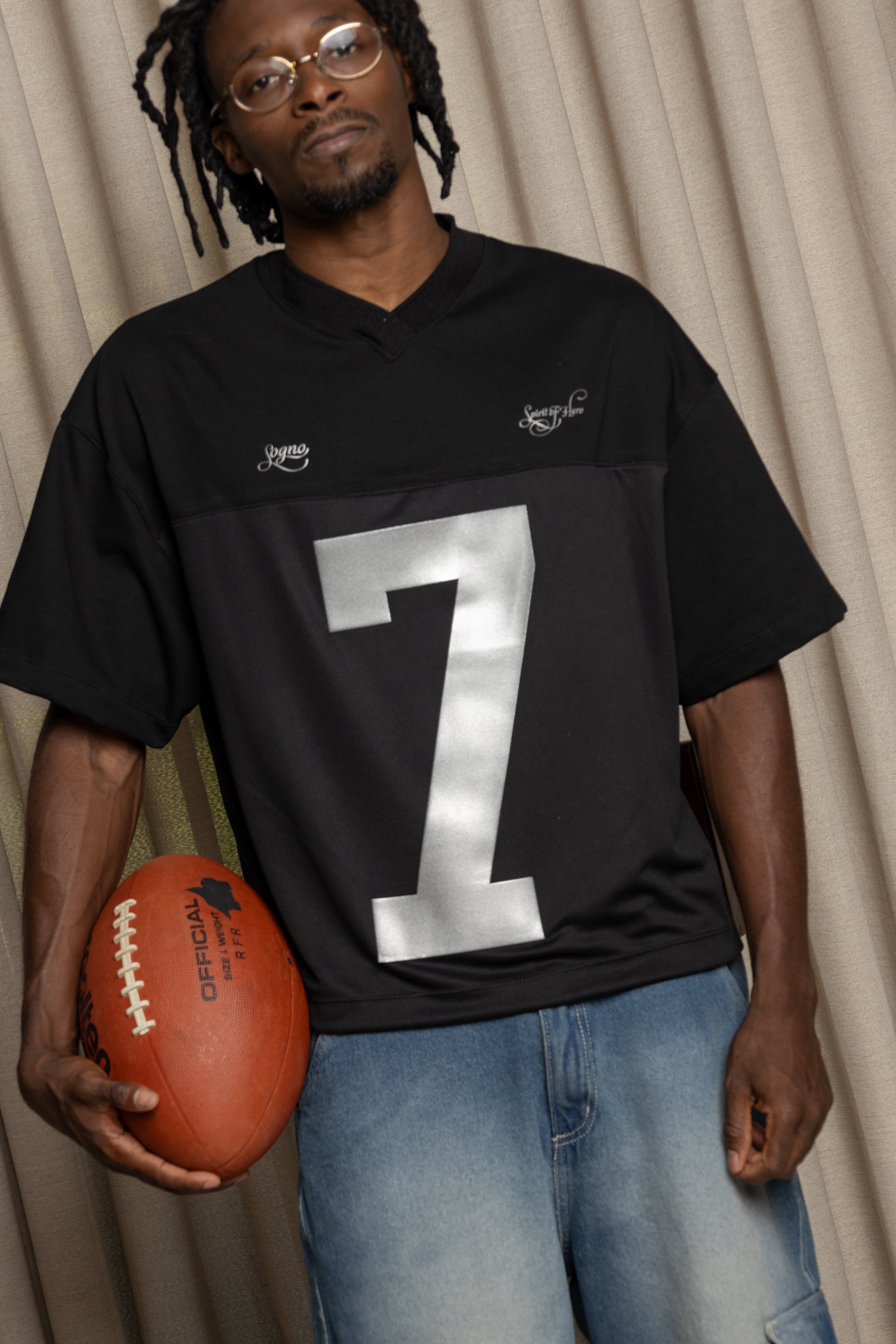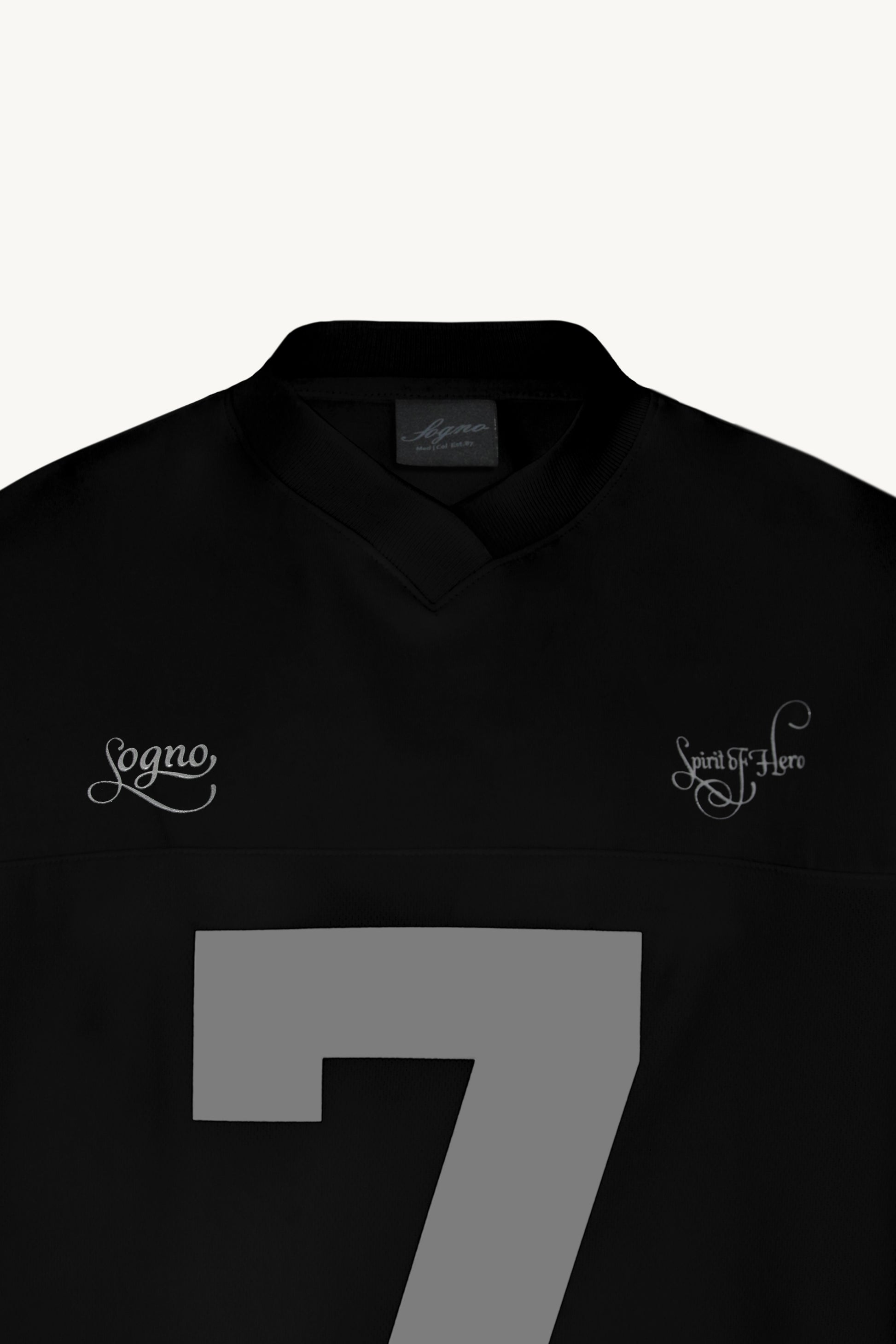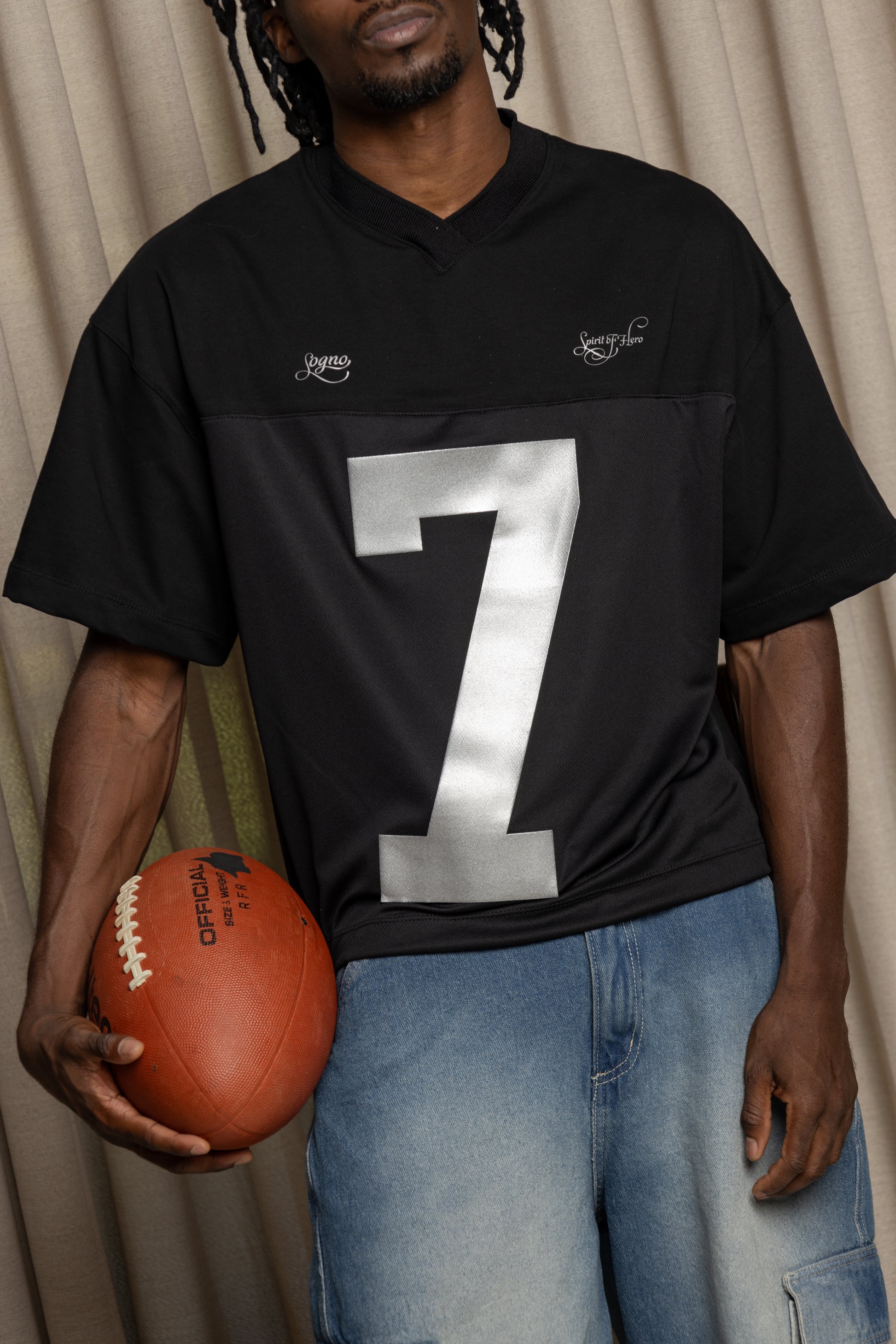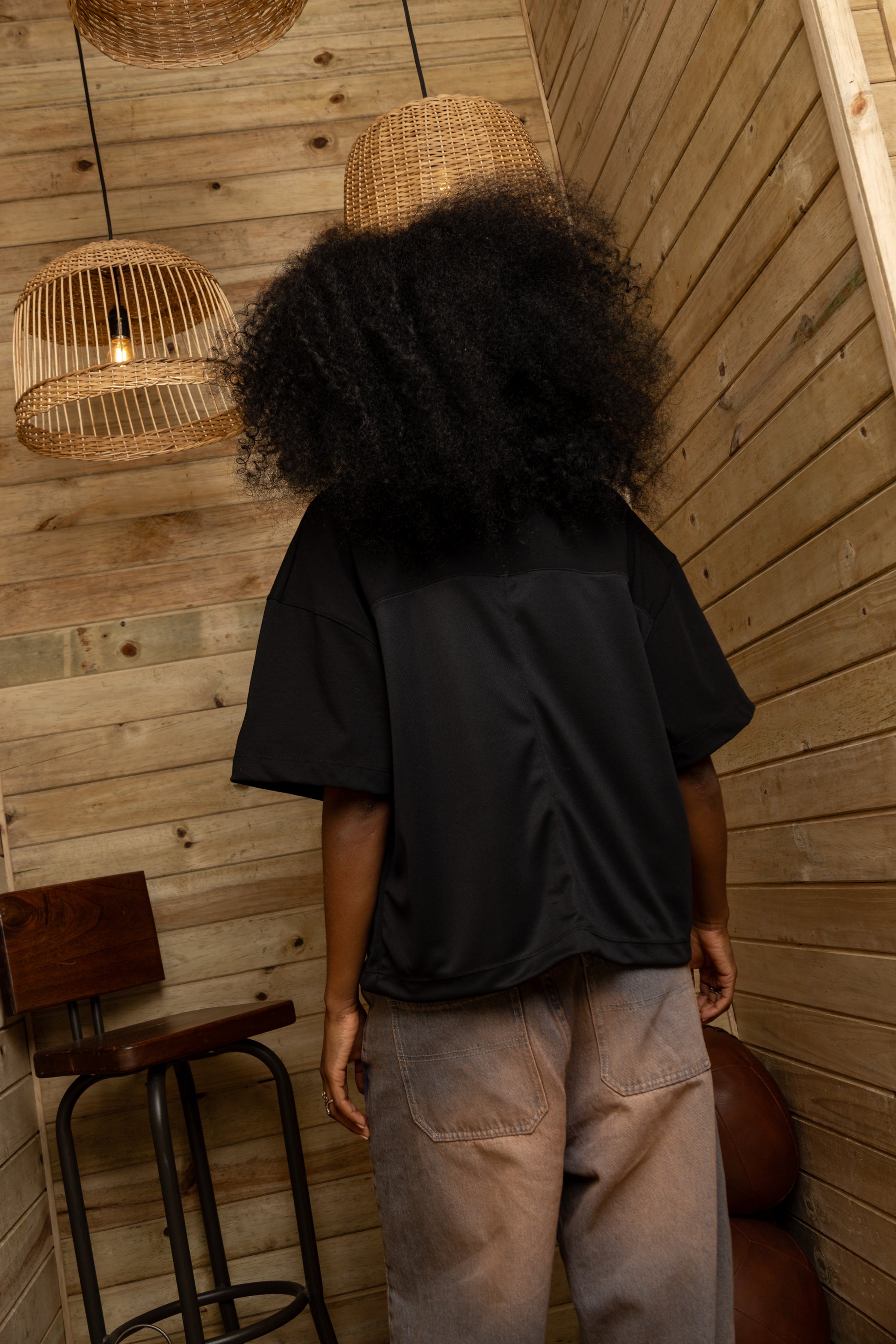 Oversized silueta boxy fit cuello en V, con corte en frente y espalda en malla, estampado en frente.