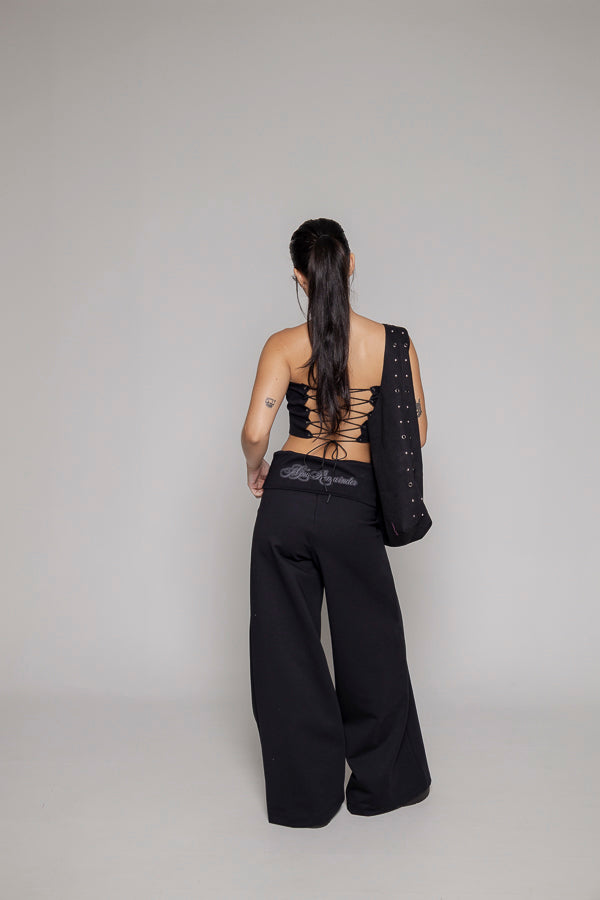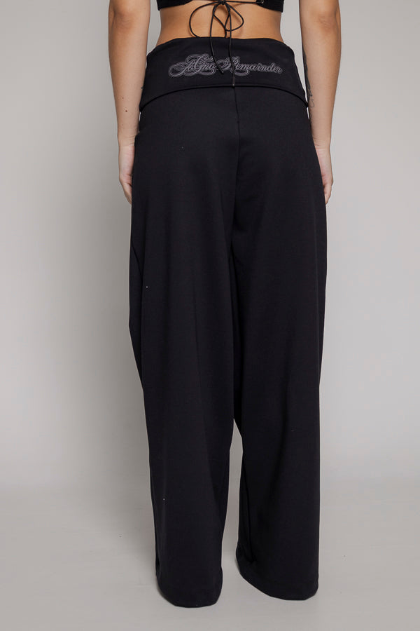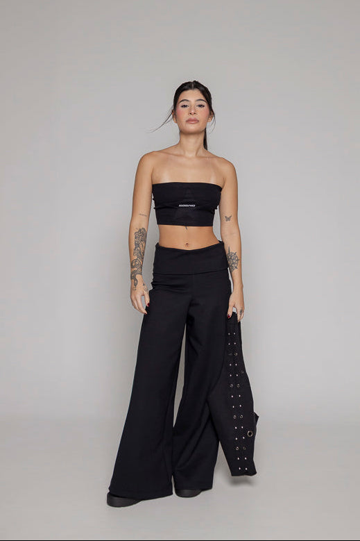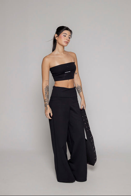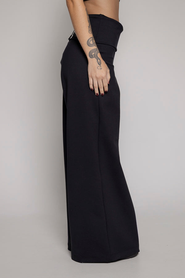 Pantalon fiare color negro, bota recta, tiene fajon doblado en cintura.