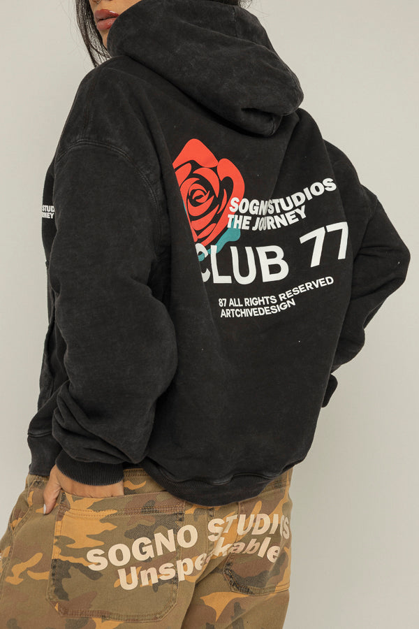 Buzo en burda unisex con chompa, lleva estampado en frente y espalda, lleva puños y fajones en rib.