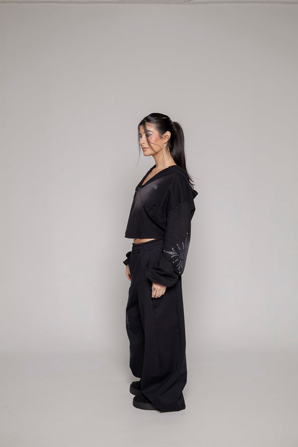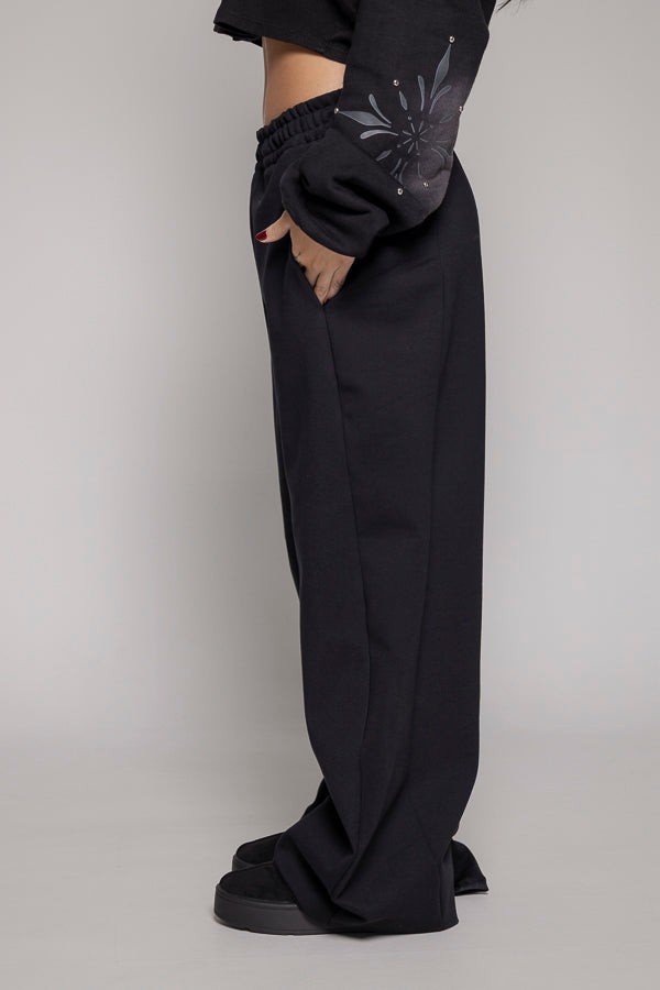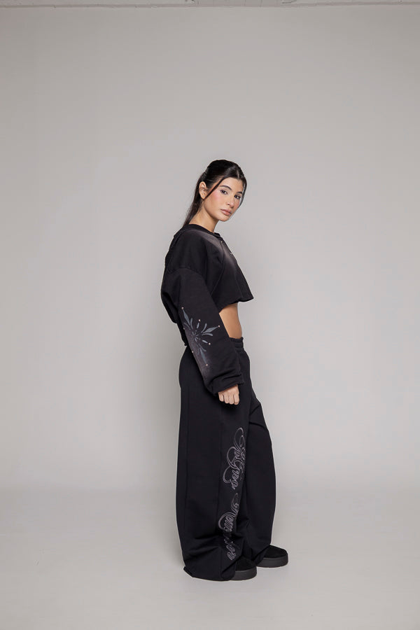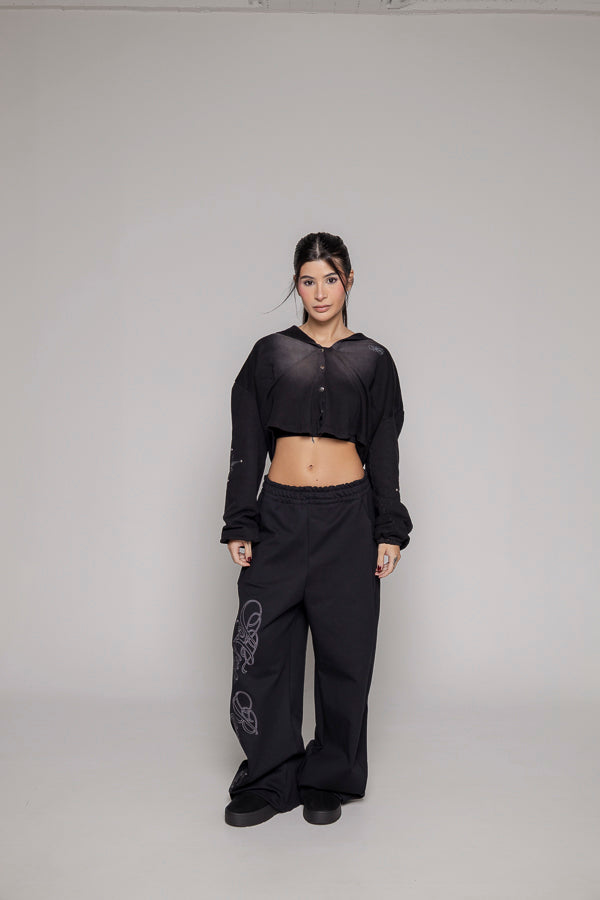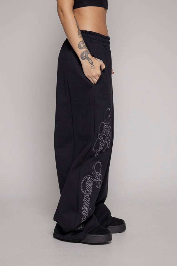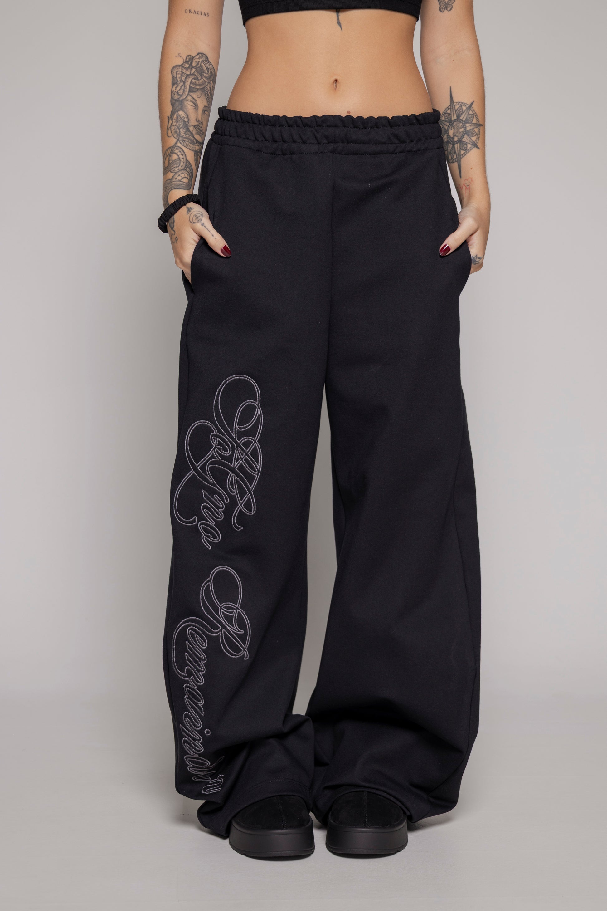 Este jogger baggy en negro con silueta femenina trae una bota recta súper cómoda y un bordado frontal que le da estilo. La cintura elástica con cordón ajustable asegura que te sientas a gusto y con el fit perfecto todo el día.