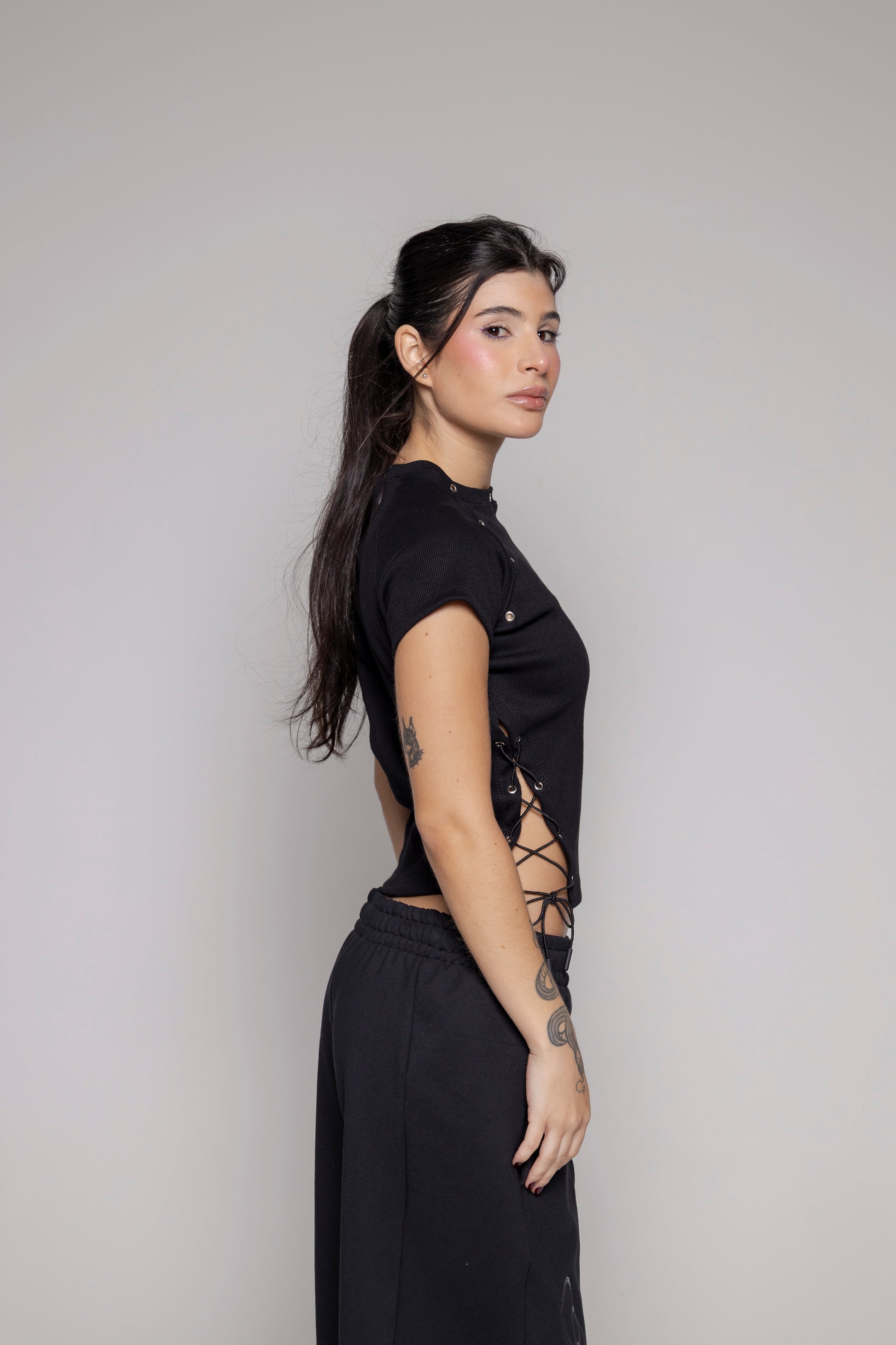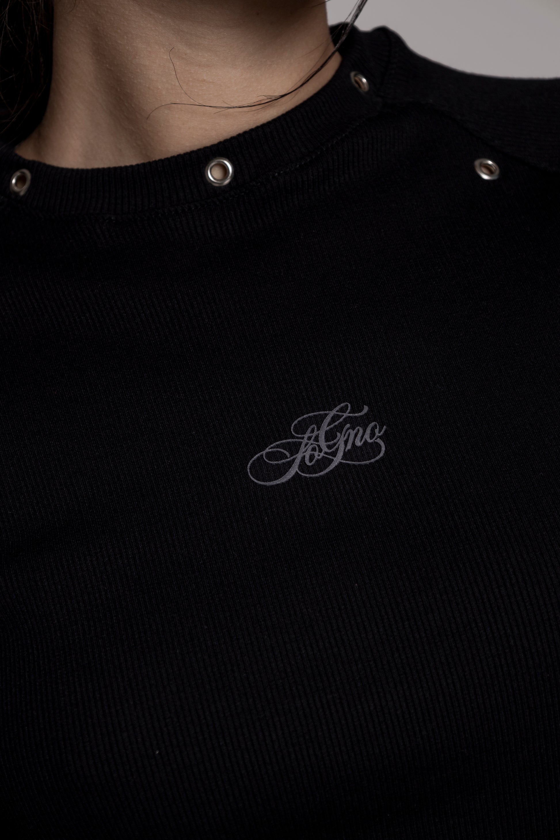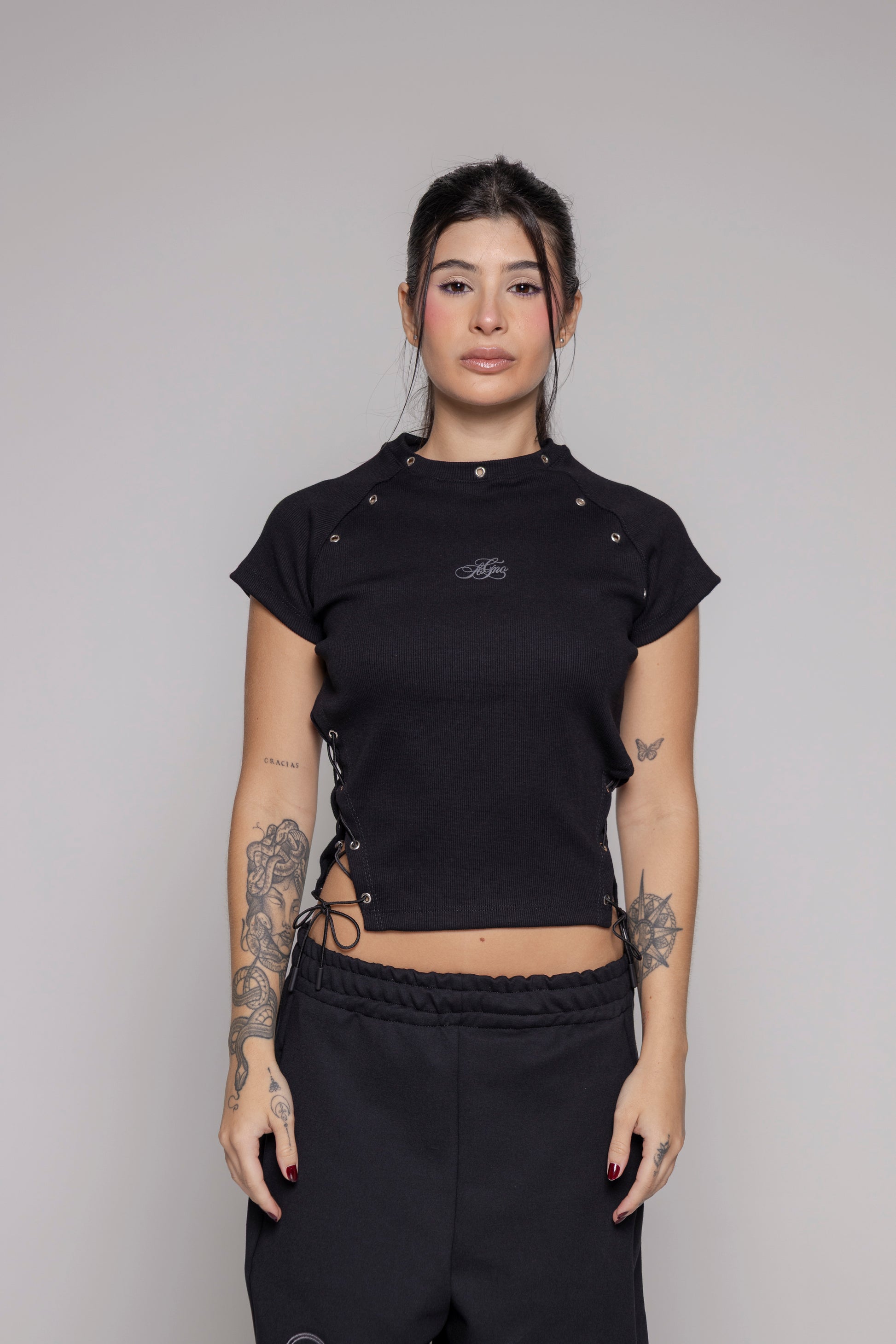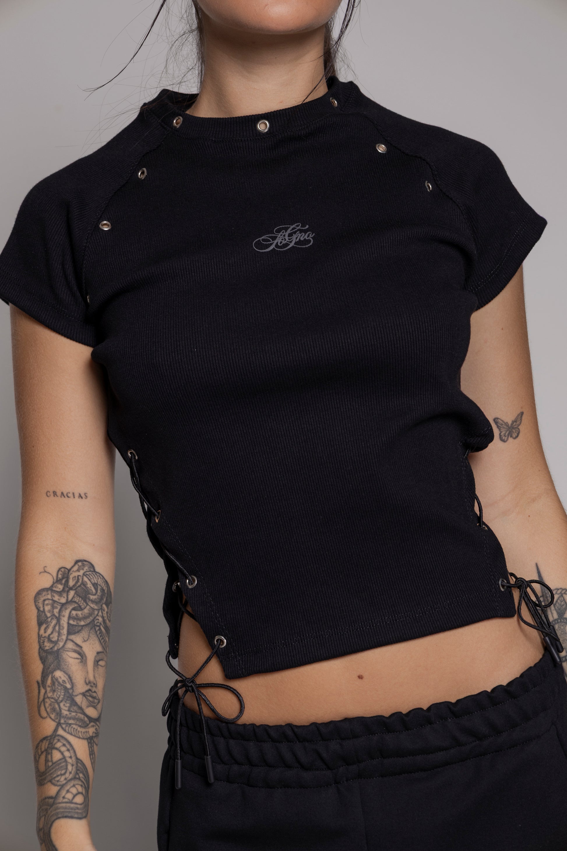 camiseta manga rangla en rib cuello redondo, estampado en frente con taches, 96% algodón 4% spandex.
