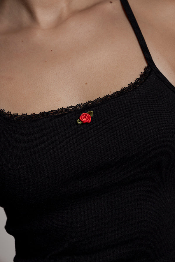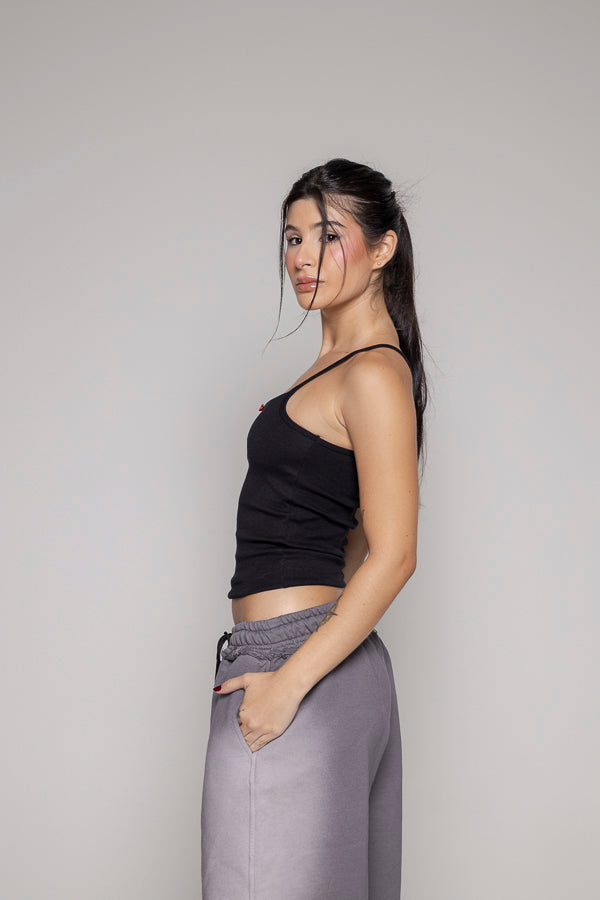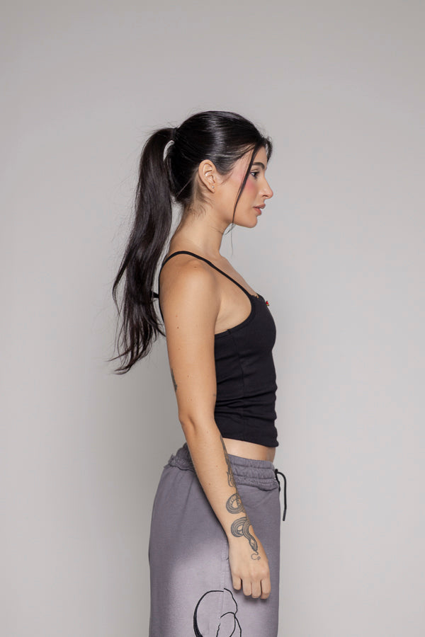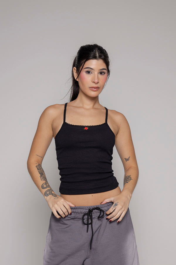 Disfruta de un look moderno y elegante con nuestro Tank Top colección Remainder. Con su color negro y aplique flor en frente, este top es perfecto para combinar con cargos, parachutes, jeans y pantalones. Su escote en espalda agrega un toque de sensualidad.