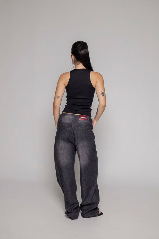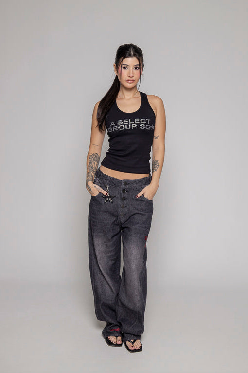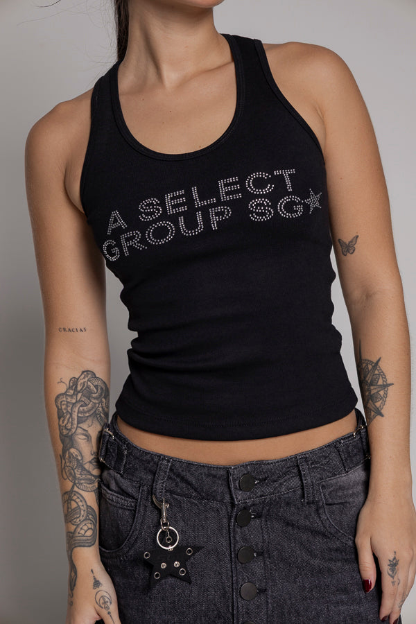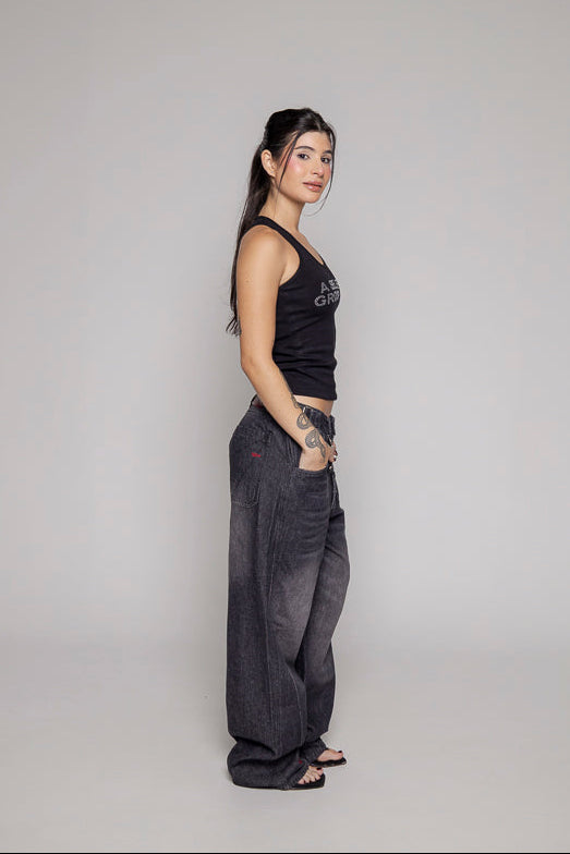 Disfruta de un look moderno y elegante con nuestro Tank Top colección Remainder. Con su color negro y aplique en frente con piedras, este top es perfecto para combinar con cargos, parachutes, jeans y pantalones.