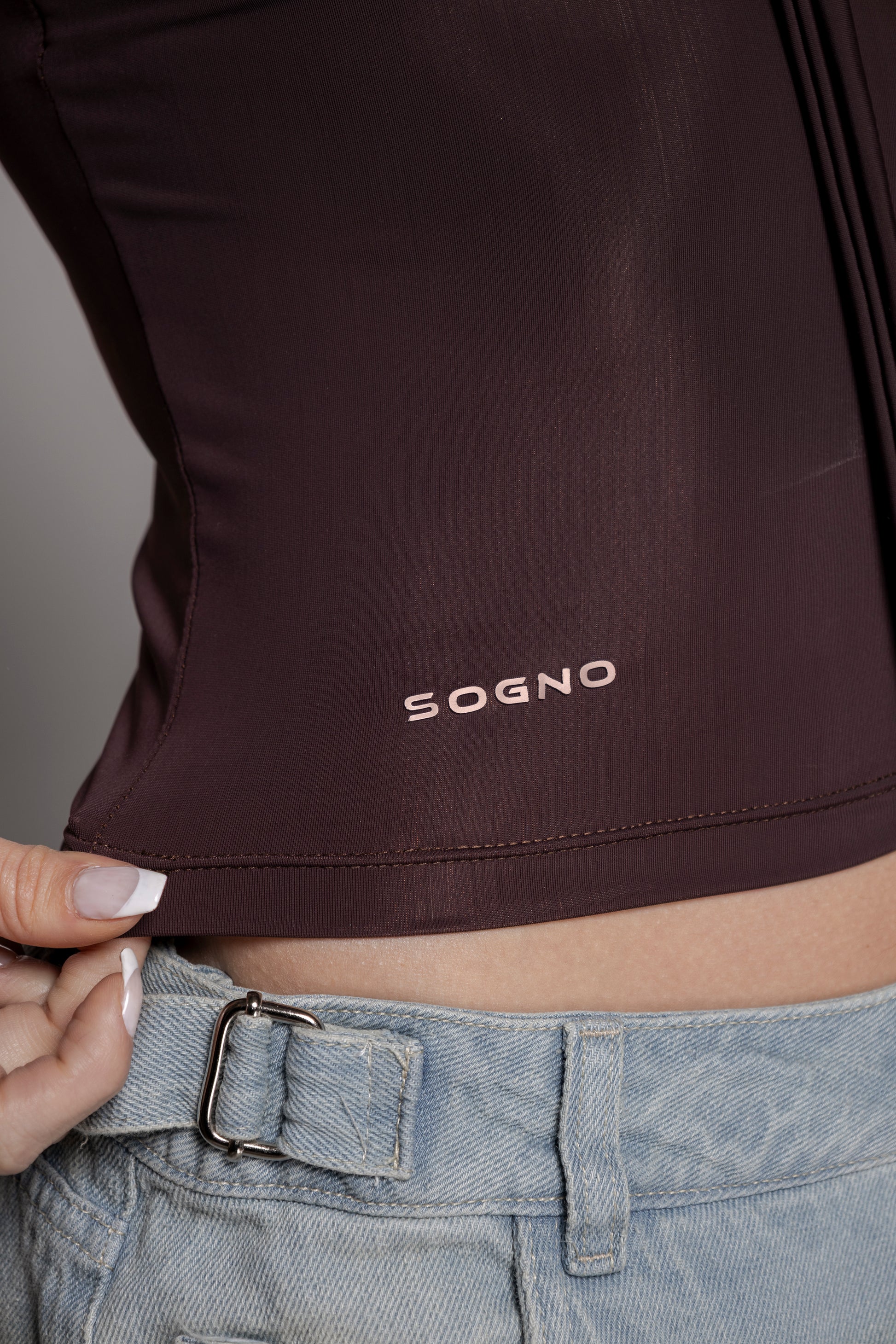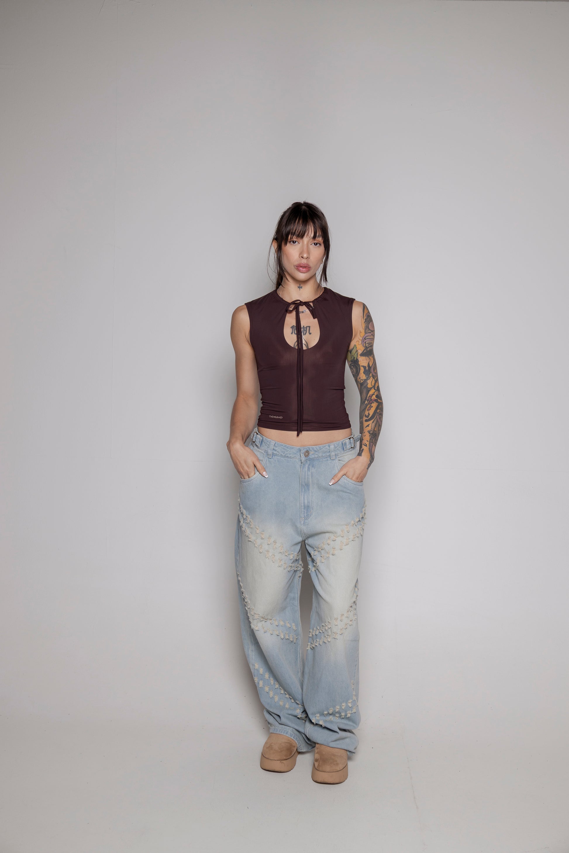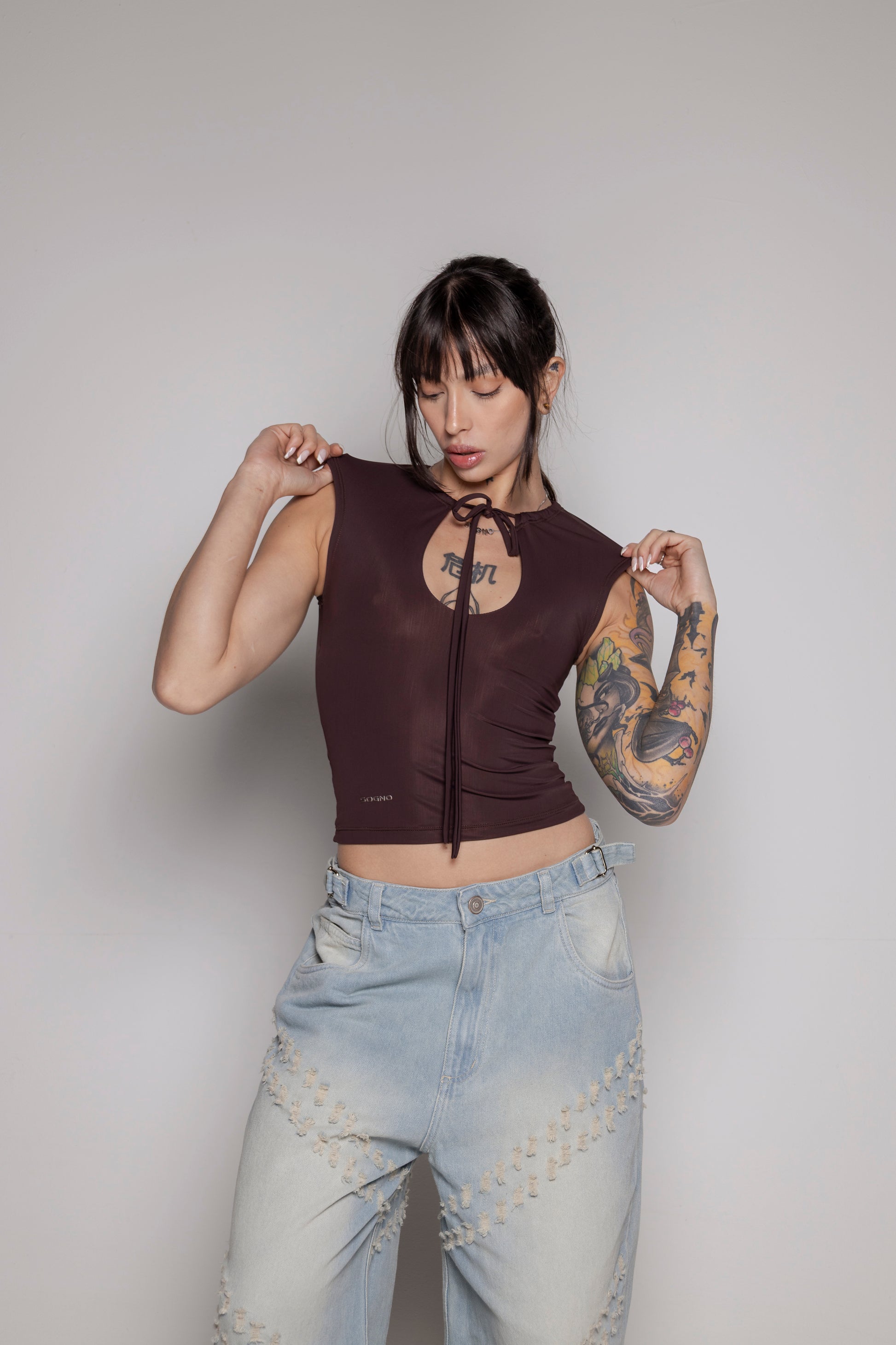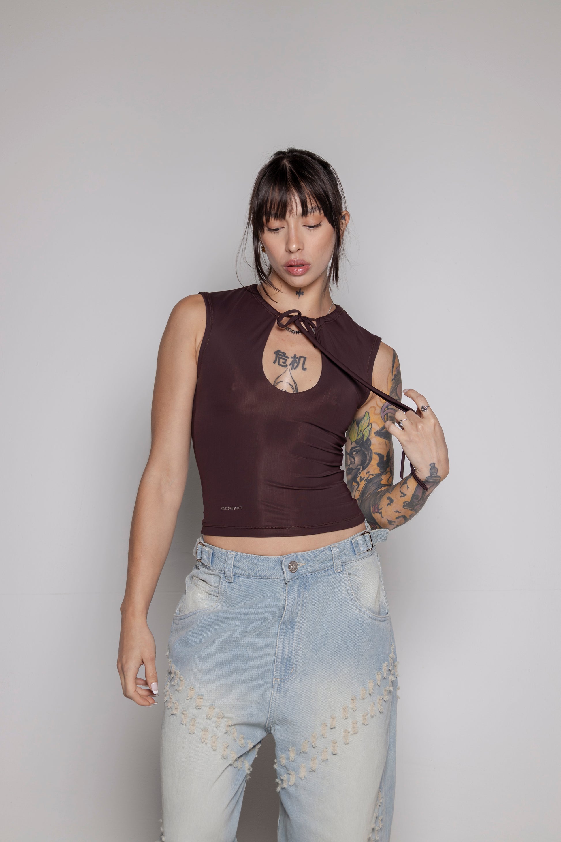 top en lycra poliéster con amarre en escote. Manga tipo japonesa.