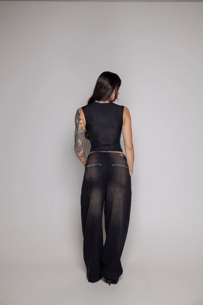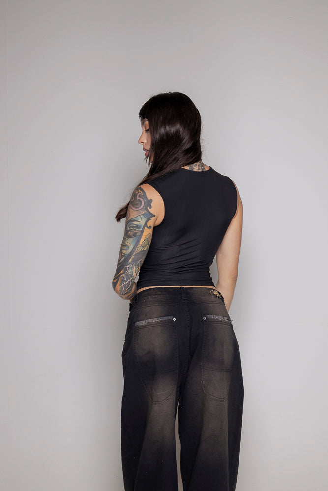 top en lycra poliéster con amarre en escote. Manga tipo japonesa.