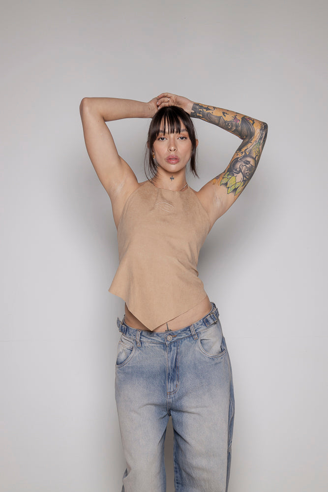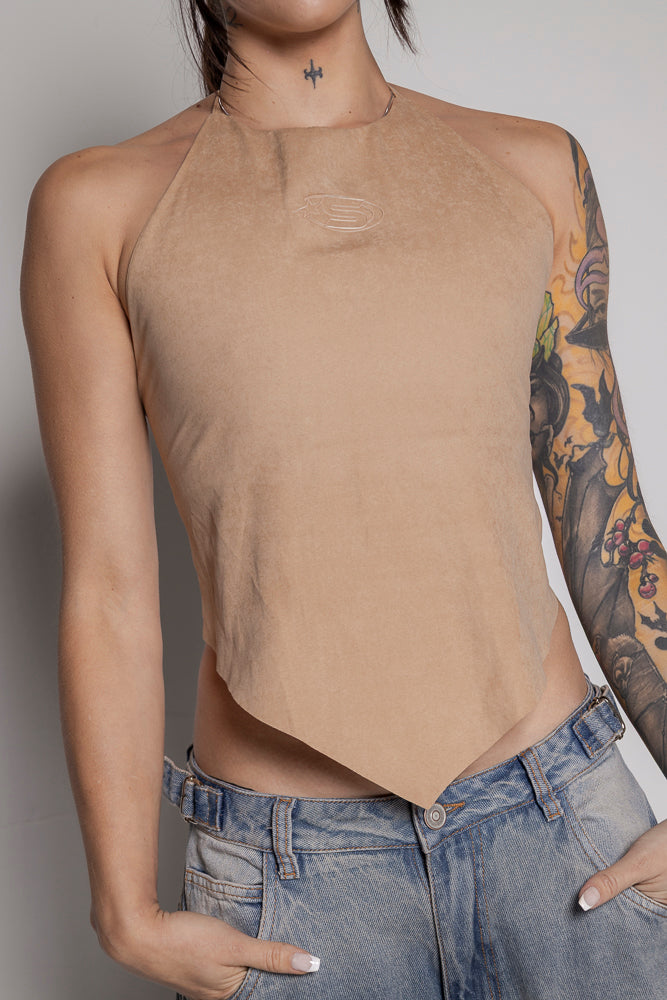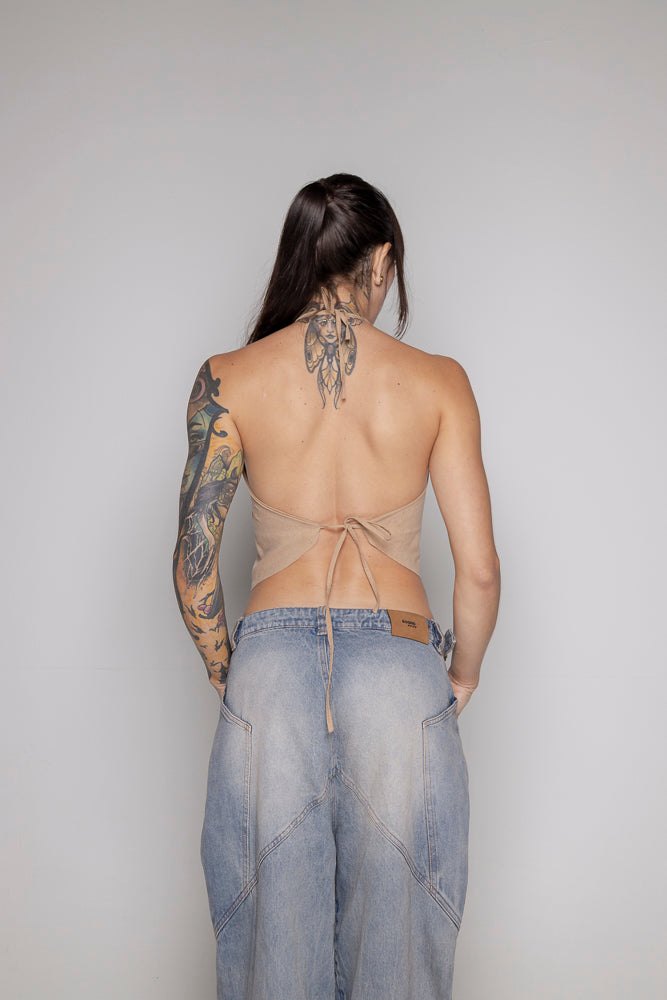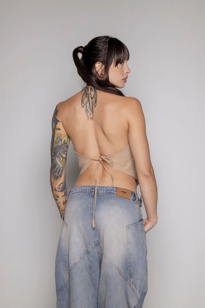 Top tipo pañoleta en tejido plano diseñado con cuello tipo halter y escote en espalda con ajuste, este top es perfecto para combinar jeans y pantalones.